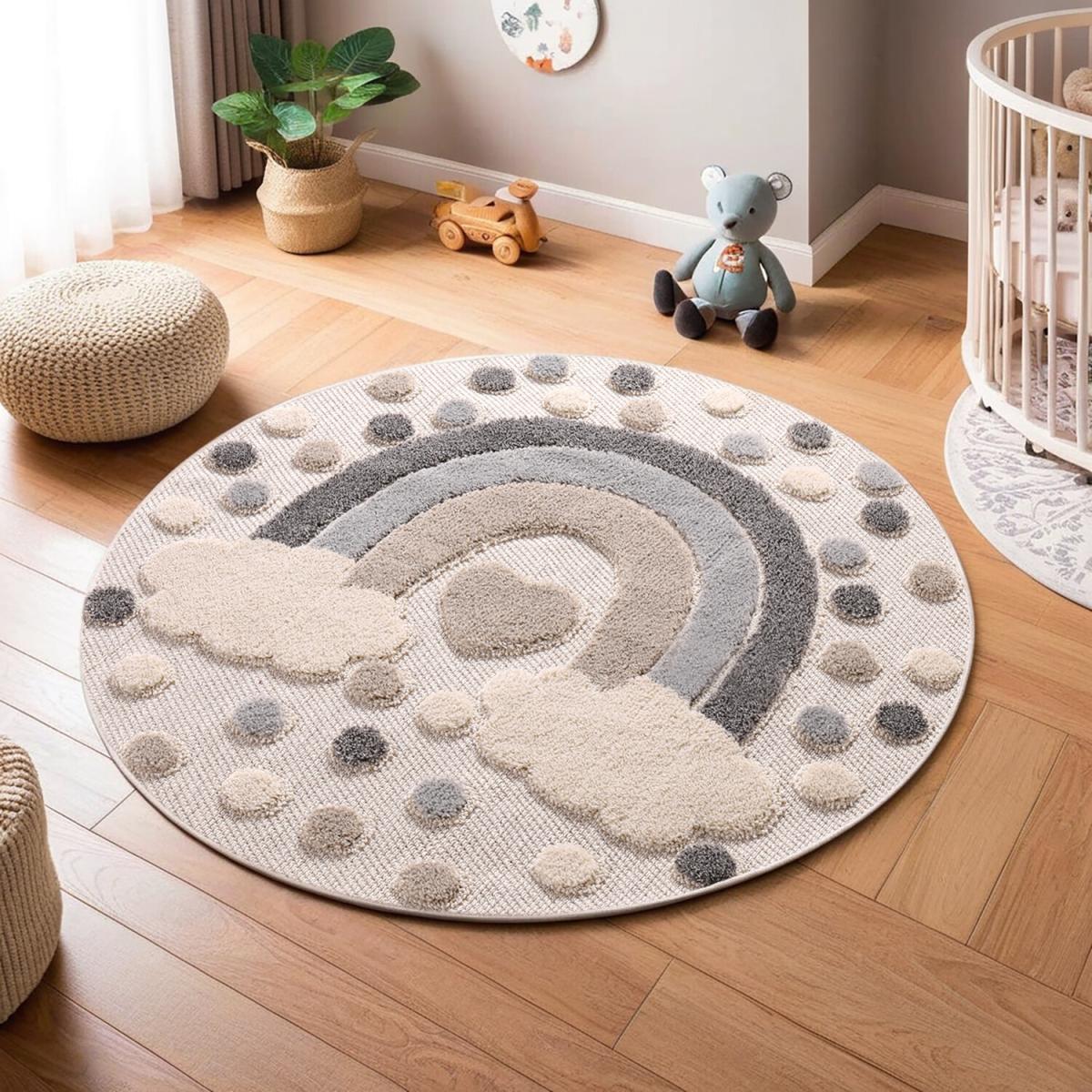 I love this rainbow rug because of its soft neutral palette and tactile texture, making it a versatile addition to both nursery and playroom interiors. Its gentle tones and playful design work well in contemporary, Scandinavian, or even boho spaces, adding a cosy and inviting feel underfoot. For styling tips, pair it with pastel or neutral-toned furniture and layered textiles for a relaxed look, or let it be the focal point with minimal surroundings. Its round shape and plush finish make it perfect for creating a cosy corner or softening a wooden or laminate floor in a child's room.