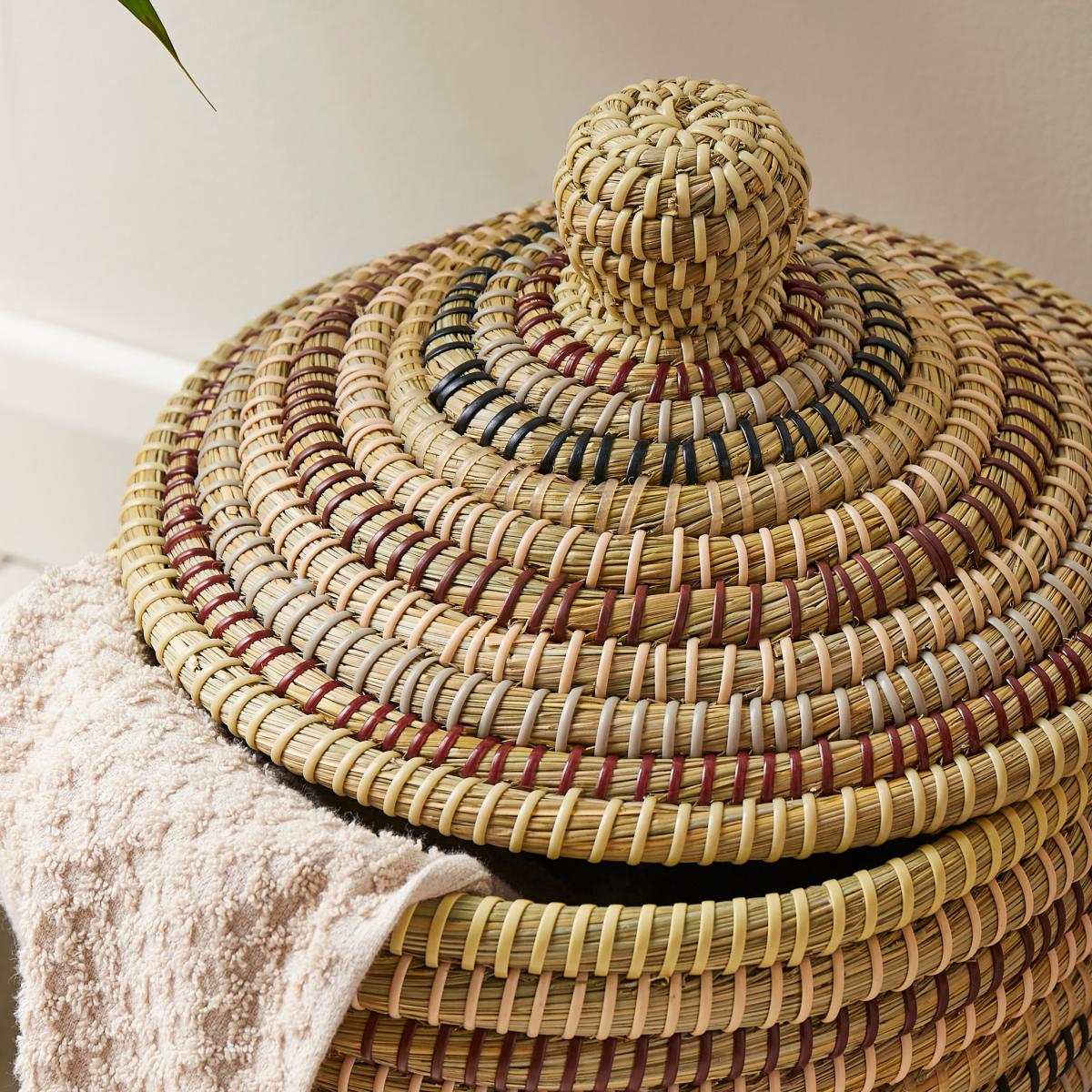 * Choice of colours* Natural woven Seagrass* Lidded basket* Matching laundry basket available This handwoven natural seagrass basket is a wonderful storage solution for the bathroom, perfectly sized to hold a variety of bathroom accessories. It comes complete with a lid and is available in either a bright coloured or natural rainbow pattern. There is a matching laundry basket available for a coordinated look.