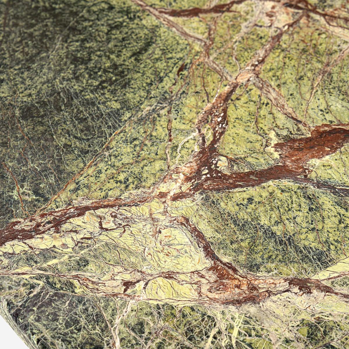 Dine in style with our contemporary solid marble dining table for a refined, luxe-touch feel to the room. Design-led sophistication is at the forefront of the craftsmanship, handcrafted by skilled local artisans in Turkey to create a truly one-of-a-kind, timeless statement piece, each unique in its own way. To add to the elegant design, the stunning green solid marble table top is supported by metal legs in a sleek bronze finish. It is sure to add a new dynamic and texture to any living room. Matching console tables and small and large side tables are available in various colours and finishes for a coordinated look in the home. As a natural material, marble has veins and unique patterns that distinguish each piece. This is not a flaw, but rather a part of the natural beauty of this beautiful dining table.