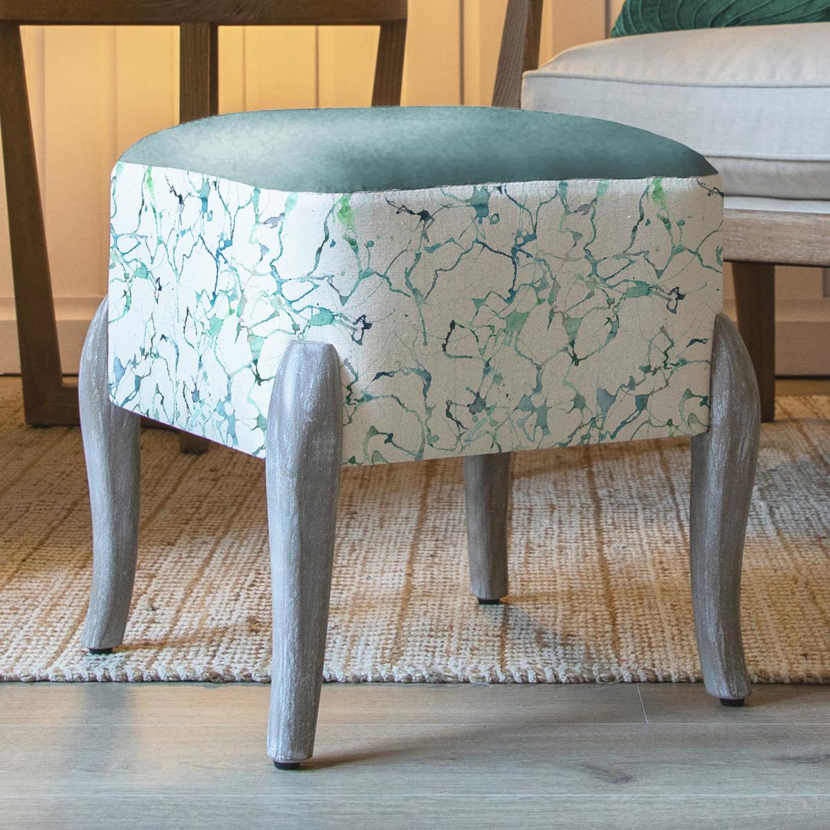 Indulge in unmatched comfort as you rest your feet upon this exquisite footstool. It showcases gracefully curved wooden legs with a weathered finish and an upholstery seamlessly adorned with a watercolour pattern. Crafted meticulously from resilient, natural materials, this piece doesn't just captivate with its charm but also provides a welcoming and comfortable spot for you to unwind.