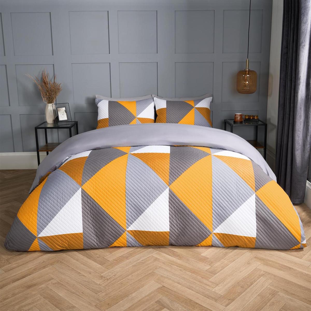 I love the Ralph Geometric Pinsonic duvet set for its bold yet versatile design - the ochre yellow adds warmth, while the geometric pattern keeps it modern and lively. It works especially well in contemporary or Scandinavian-inspired interiors, where clean lines and subtle colour accents are key. To style it effectively, try pairing with neutral or grey bed linens to let the pattern stand out, and introduce textured cushions or throws in complementary shades like soft greys, whites, or even muted blues for a layered, cosy look. Practical styling tips include keeping bedside accessories minimalist to avoid clutter, and ensuring the bed is the focal point of the room, which this set effortlessly achieves with its striking design.