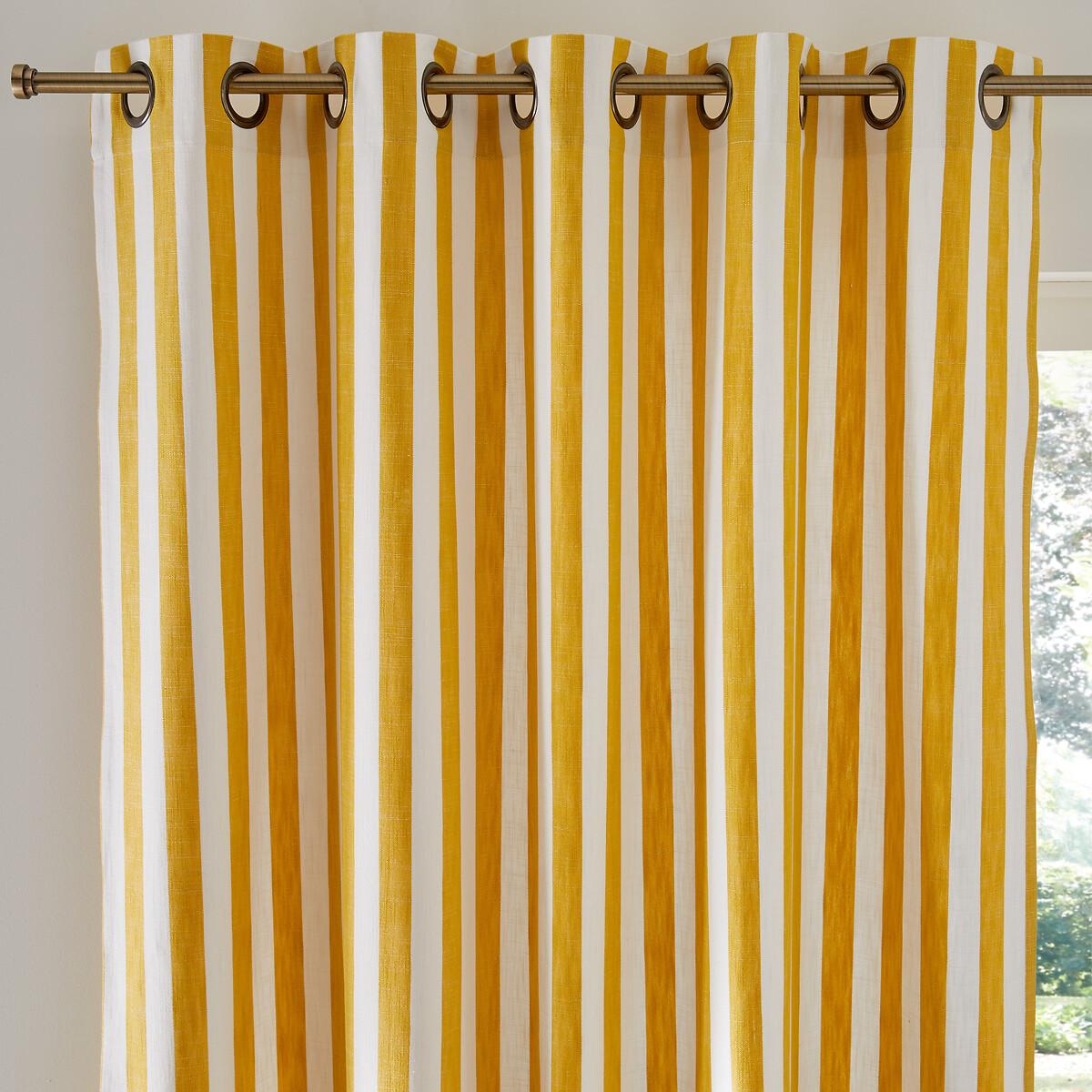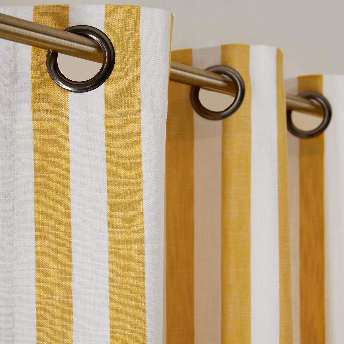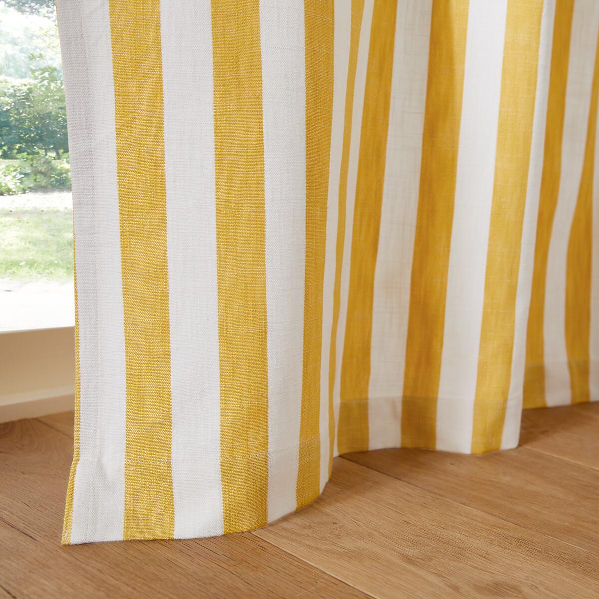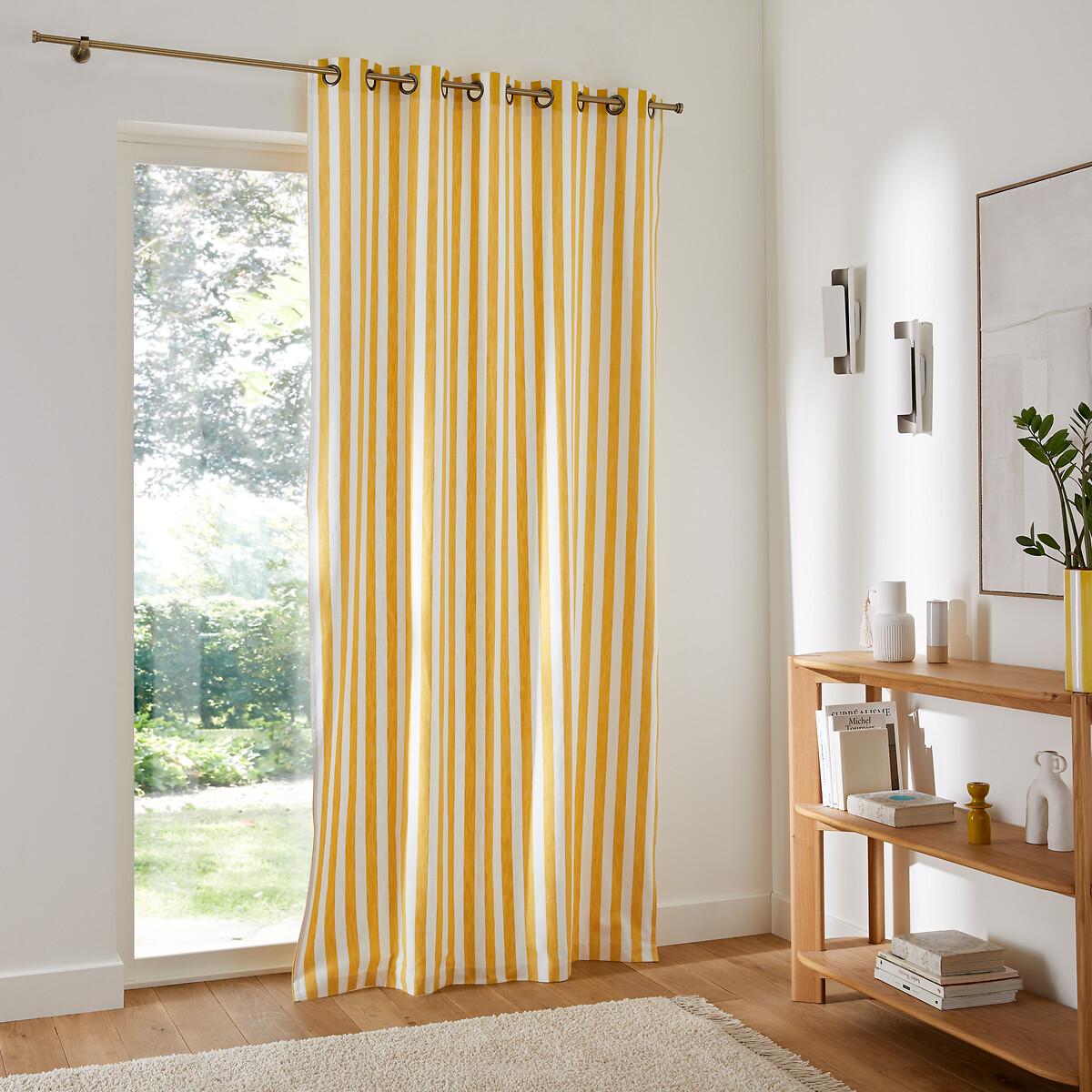 The Ramla striped curtain creates a warm, cosy atmosphere in your home. The eyelets guarantee nice regular waves and ensure the fabric falls beautifully. They slide perfectly on the rod, making it easy to open and close the curtain. Product Details • Screening • 100% cotton, 320g • Top finish : eyelets • Inner diameter of eyelets: 4cm • Finished bottom :Plain hemmed edging • To help you in the choice and maintenance of your curtains, do not hesitate to consult our guide by typing "Curtain Buying Guide" in our search engine on the site. Care Advice • Machine washable at 30°C • Maximum shrinkage after washing : Approximately 5 to 7%. Fabrics made from natural fibres may shrink in the first wash. Always wash your curtains before making any alterations. • Do not tumble dry • If you don't need to iron them (linen curtains, Voile Panel...), let the curtains air dry by hanging them immediately after washing, making sure to spread them out to their full width. • If you want to iron your curtains, we recommend using a low-temperature steam iron or a steamer. Dimensions • Drop 180 x W135cm • D260 x W135cm • OEKO-TEX® Standard 100. Standard 100 certification by OEKO-TEX® tests textile products for harmful substances via an independent, international label.