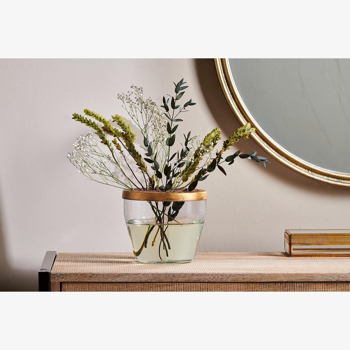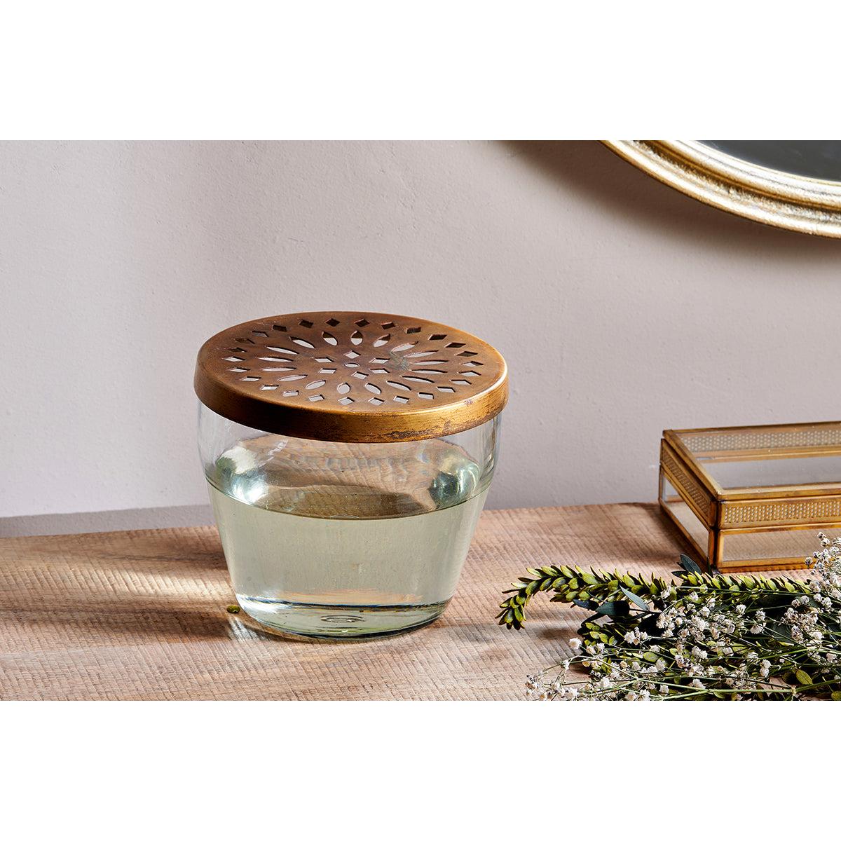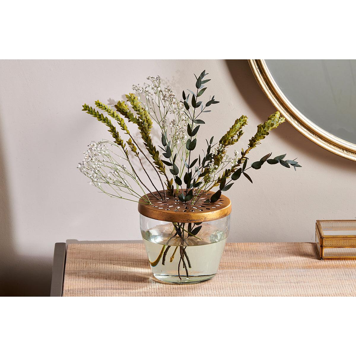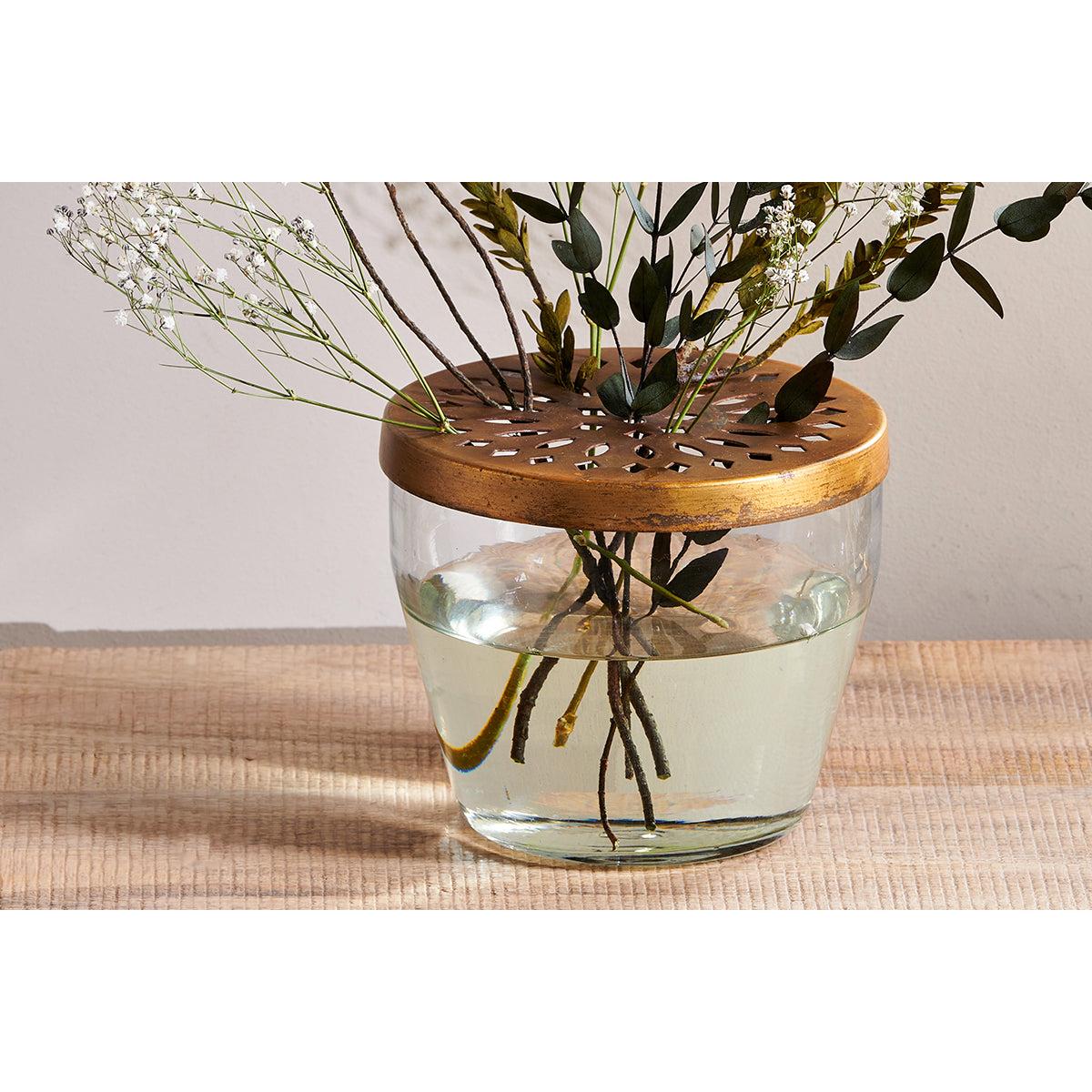Our circular Ramla vase is decorated with an antique brass lid. The cut out pattern on the lid is designed to hold the stems of flowers and foliage, creating striking displays.