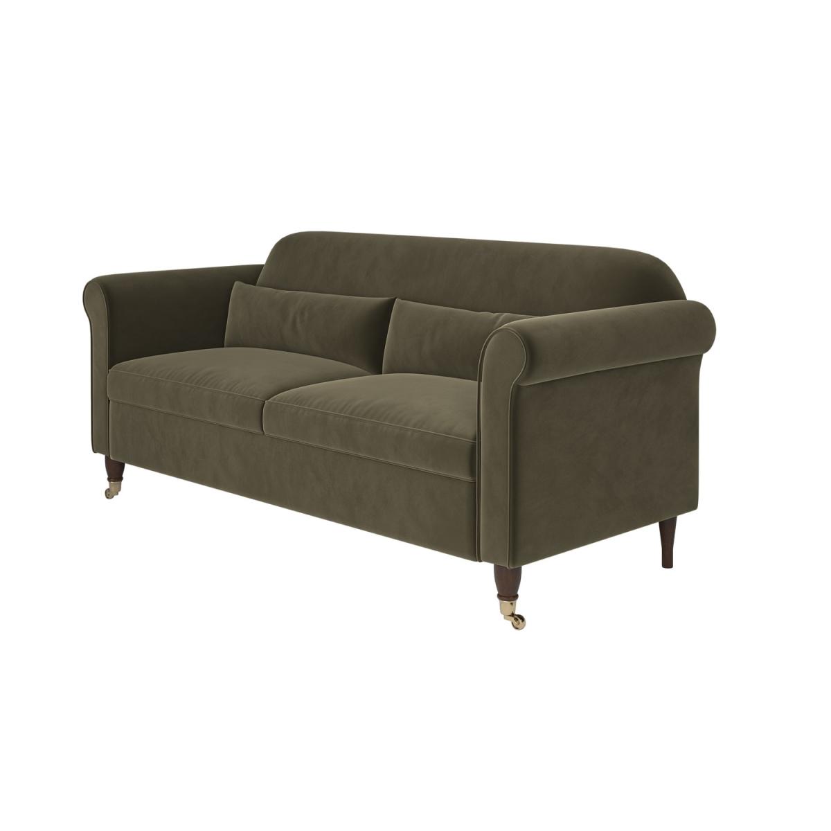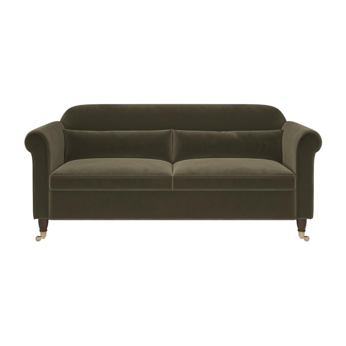 Scatter Cushions Included Finished in soft yet durable khaki green velvet, Ramona offers both comfort and style, adding a warm and inviting feel to your living space. Features classic scroll arms and turned wooden legs with castors, combining vintage charm with modern practicality. The foam and fibre-filled seats provide exceptional comfort and support, perfect for family gatherings or relaxation. Comes with coordinating scatter cushions that complement the overall design, enhancing both comfort and style. Removable cushion covers make cleaning and maintenance a breeze, ensuring lasting beauty and functionality. The Ramona Khaki Green Velvet 3-Seater Traditional Sofa brings a timeless elegance to any living room. Upholstered in soft yet durable khaki green velvet, Ramona offers both warmth and sophistication, making it an inviting centrepiece for your space. With classic scroll arms and turned wooden legs with castors, it blends traditional charm with modern touches. The foam and fibre-filled seats ensure long-lasting comfort and support, while the removable cushion covers make cleaning easy. Perfect for families, the Ramona sofa adds character and comfort, making it an ideal choice for any home.