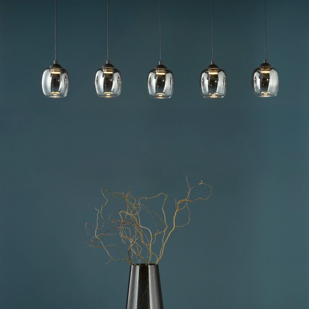 Ramona 5-light LED pendant bar, featuring a matte black finish and ombre smoked glass shades. The Ramona LED pendant bar is a sleek and contemporary lighting fixture that combines style and function. Featuring a matte black finish, this pendant bar is complemented by five ombre smoked glass shades, creating a striking contrast and adding a touch of sophistication to any room. The shades gently diffuse the light, casting a soft, ambient glow that enhances the atmosphere of your space. Perfect for modern dining areas, kitchens or living rooms, the Ramona pendant bar offers both aesthetic appeal and practicality with its energy-efficient LED lighting. The durable and minimalist design, paired with the elegant ombre effect of the glass shades, makes it an ideal choice for those seeking to elevate their home décor. Ramona 5-light LED pendant bar, featuring a matte black finish and ombre smoked glass shades. The Ramona LED pendant bar is a sleek and contemporary lighting fixture that combines style and function. Featuring a matte black finish, this pendant bar is complemented by five ombre smoked glass shades, creating a striking contrast and adding a touch of sophistication to any room. The shades gently diffuse the light, casting a soft, ambient glow that enhances the atmosphere of your space. Perfect for modern dining areas, kitchens or living rooms, the Ramona pendant bar offers both aesthetic appeal and practicality with its energy-efficient LED lighting. The durable and minimalist design, paired with the elegant ombre effect of the glass shades, makes it an ideal choice for those seeking to elevate their home décor.