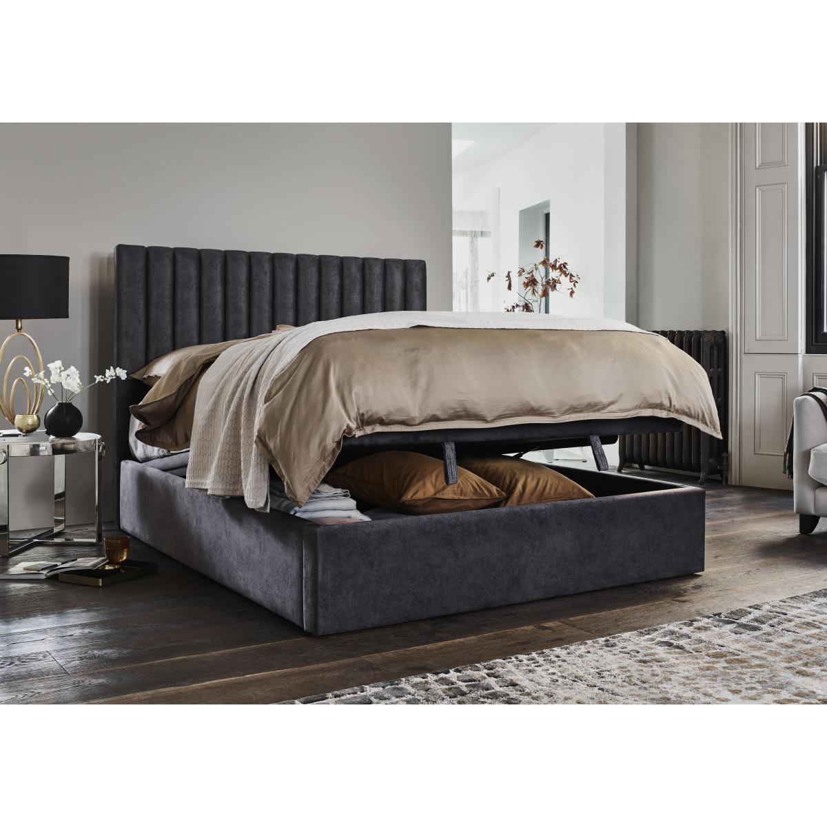 The Ramos headboard delivers sleek contemporary style with the added bonus of space-saving underbed storage. The beautifully fluted headboard looks sophisticated – and it’s a comfy spot to spend weekend mornings. Store spare bed linen, seasonal clothing or rarely worn shoes with ease thanks to the roomy underbed storage compartment. Made with a piston-assisted lift mechanism, so your things are never out of reach, even though they’re out of sight. Made in Britain and finished with handstitched details. Rest up in regal style with the Ramos ottoman bed frame. Its beautiful fluted headboard pairs with spacious underbed storage – perfect if you’re short on space or have a large shoe collection. Why you'll love it Grand bedframe with space-saving underbed storage. Sleek contemporary style with a classic silhouette. Fluted headboard. Available in double, king and super king sizes. Exclusive to Furniture Village. What you need to know Mattress not included. Piston-assisted lift mechanism for easy-access storage. Clean weekly using a soft brush or vacuum with the curtain attachment. Annual professional cleaning is recommended. Some fabrics can show wear on areas of more use or in direct sunlight.