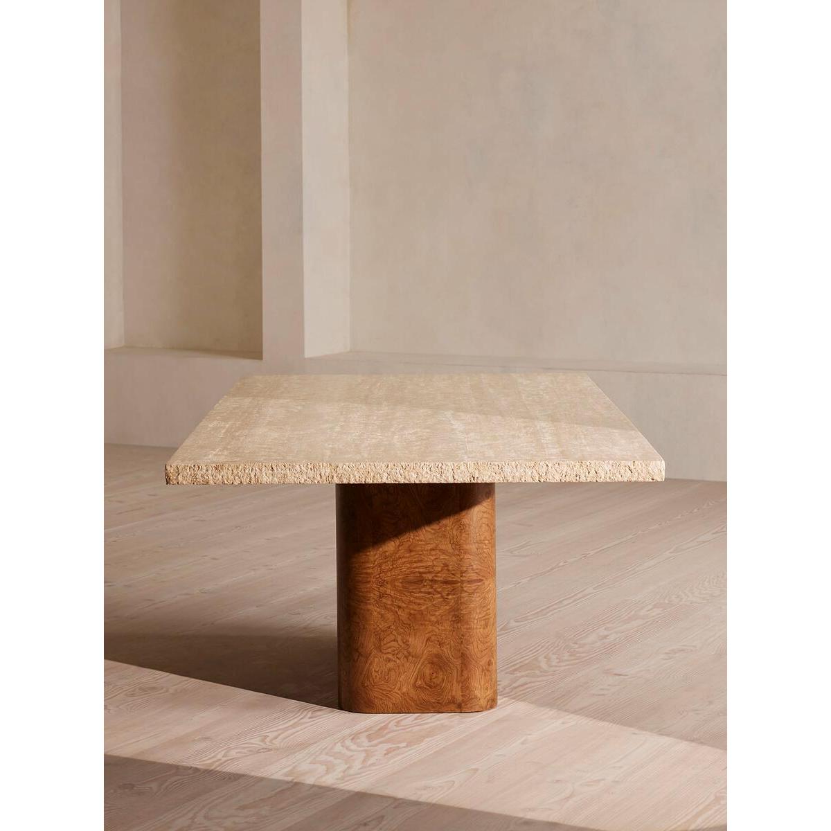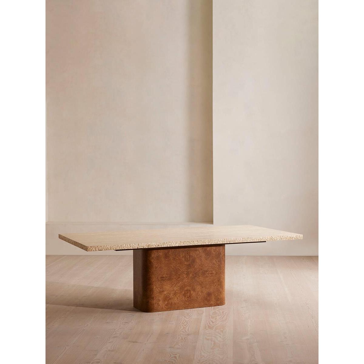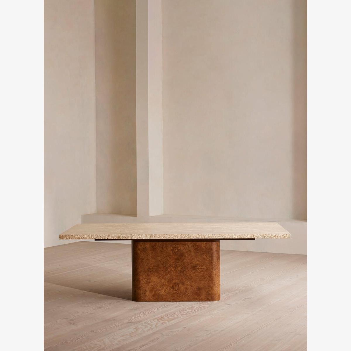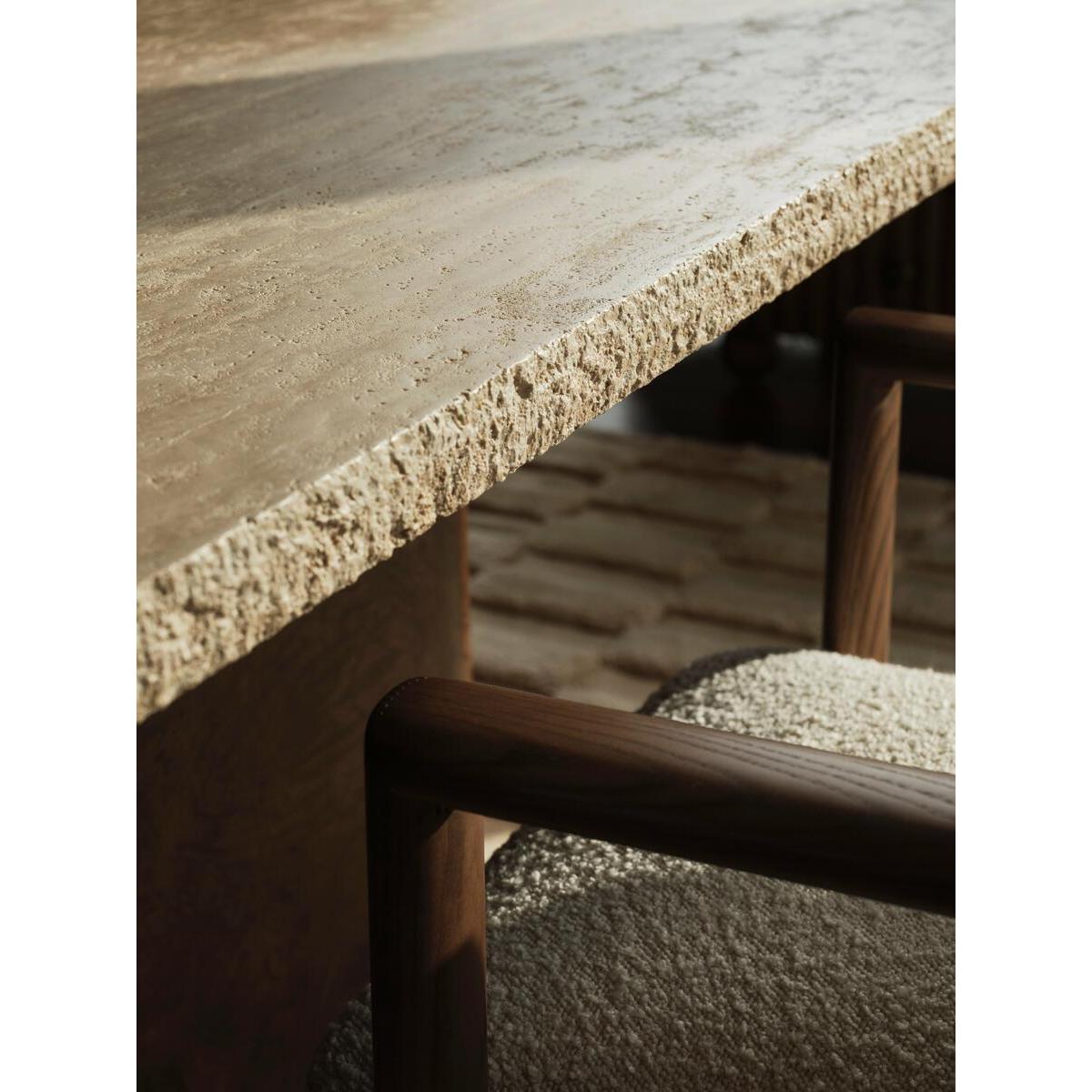 Our Ramsey dining table celebrates the natural properties of raw materials, which can also be seen around Soho Roc House. The top has been crafted used a filled, solid travertine stone sourced from Turkey with a raw edge for an organic finish. A pedestal base in olive ash burl adds a textural contrast, with this veneer highly valued for its unique depth of colours and grain patterns. We've applied a new wood stain to highlight the decorative detail of this particular finish. Natural variations in the stone and wood means no two tables are the same, making it a unique talking-point piece in the dining room. Travertine dining table Filled, solid travertine top Stone sourced from Turkey Raw edges Pedestal base in olive ash burl Natural variations in the stone and wood veneer mean no two designs are the same Inspired by Soho Roc House