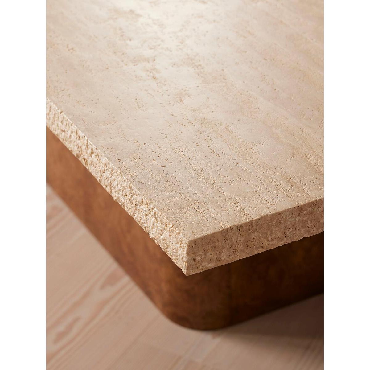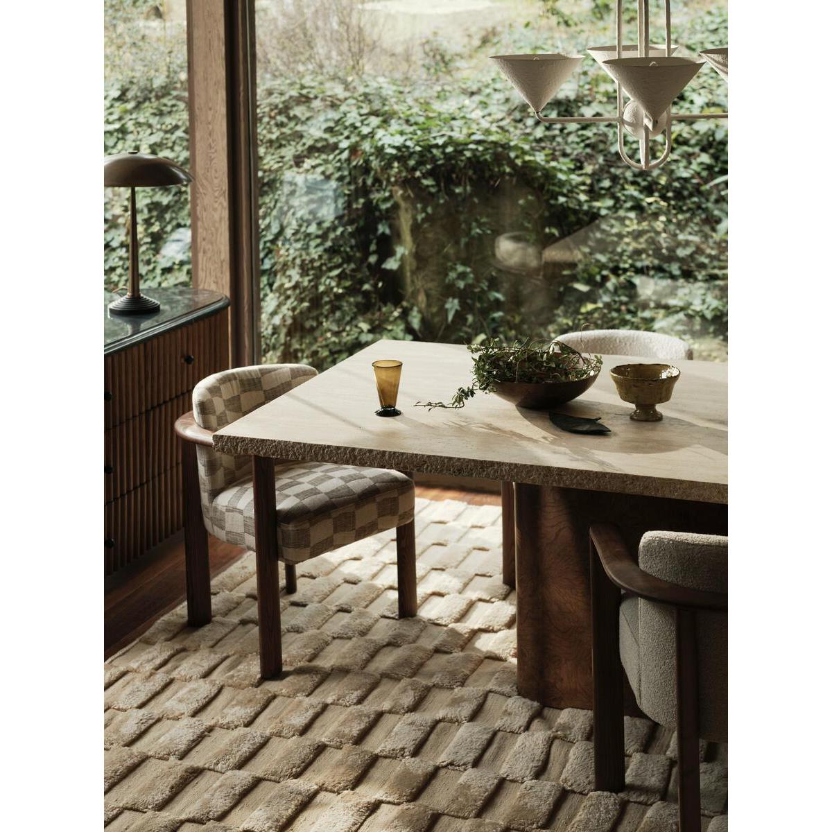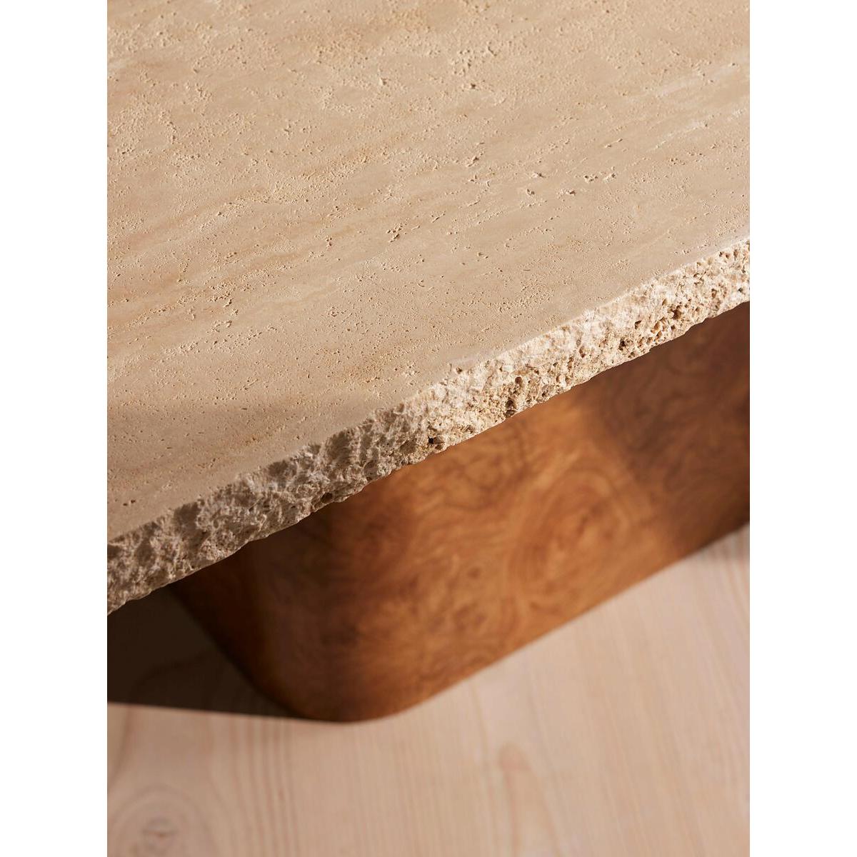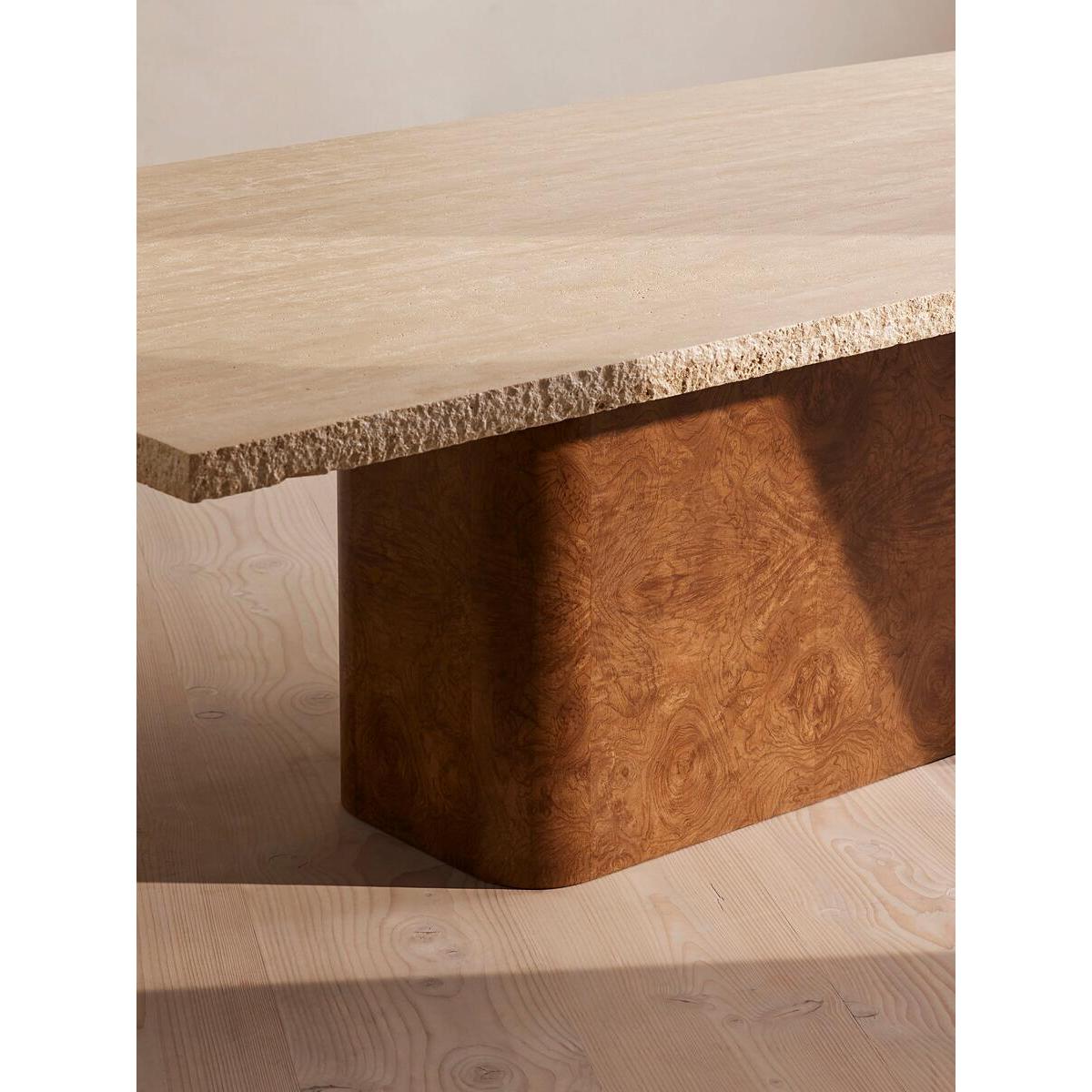 Our Ramsey dining table celebrates the natural properties of raw materials, which can also be seen around Soho Roc House. The top has been crafted used a filled, solid travertine stone sourced from Turkey with a raw edge for an organic finish. A pedestal base in olive ash burl adds a textural contrast, with this veneer highly valued for its unique depth of colours and grain patterns. We've applied a new wood stain to highlight the decorative detail of this particular finish. Natural variations in the stone and wood means no two tables are the same, making it a unique talking-point piece in the dining room. Travertine dining table Filled, solid travertine top Stone sourced from Turkey Raw edges Pedestal base in olive ash burl Natural variations in the stone and wood veneer mean no two designs are the same Inspired by Soho Roc House