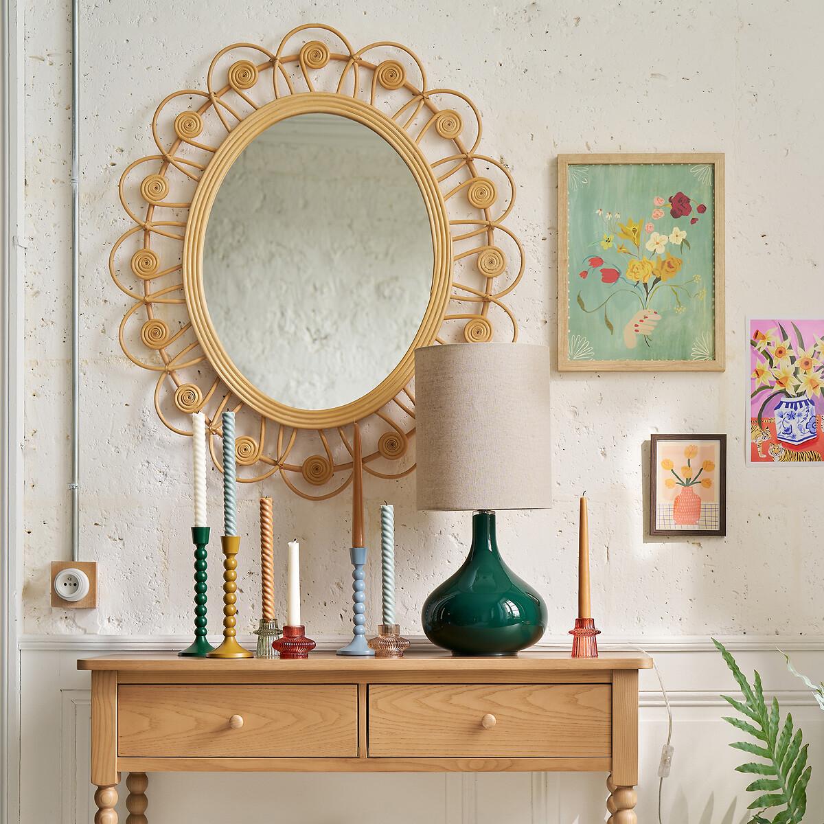 There is more than one way to make your interior flourish. With its delicately crafted flower shape, the Ramza rattan mirror is a great option. Its large dimensions are ideal for decorating the wall of a living room or bedroom. Product Details • Made from rattan • Oval shape • Hand-crafted, each piece is unique: colours and dimensions may vary from product to product. • Wall fixing (screws and plugs not supplied)Dimensions • Width: 82cm • Height: 93cm • Thickness: 2cm. Dimensions and weight of parcel1 parcel • L90 x H101 x D12cm. 6.5kg