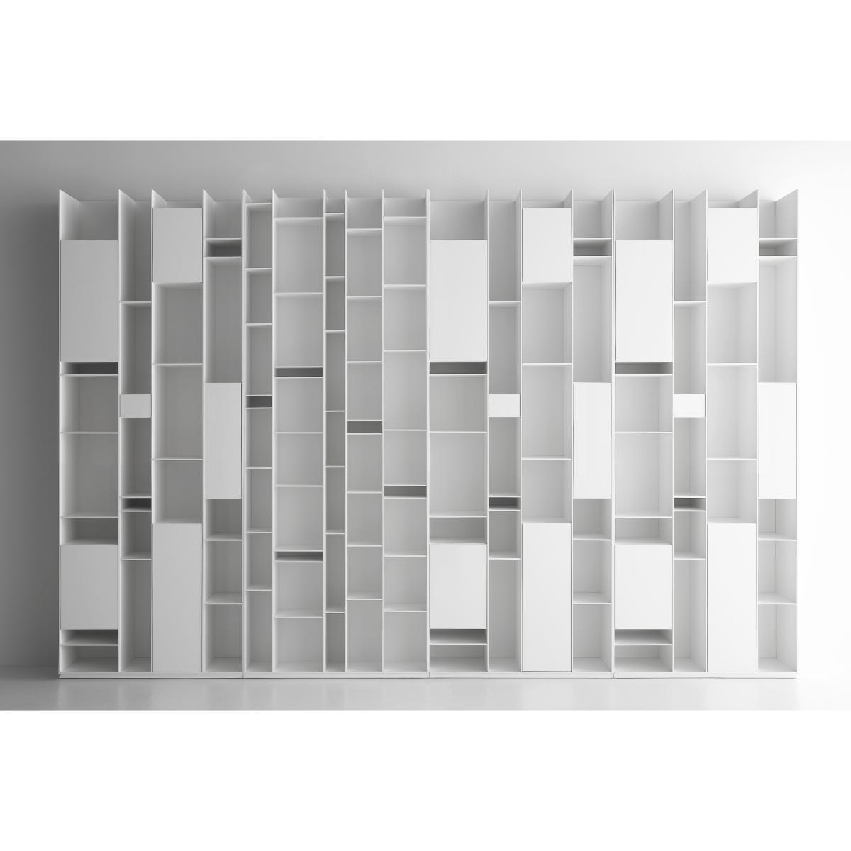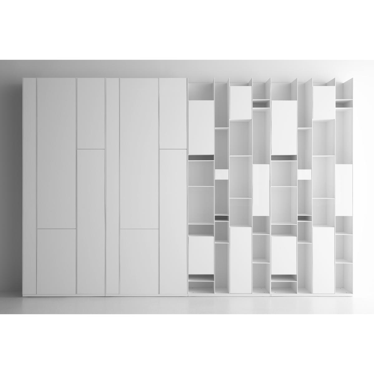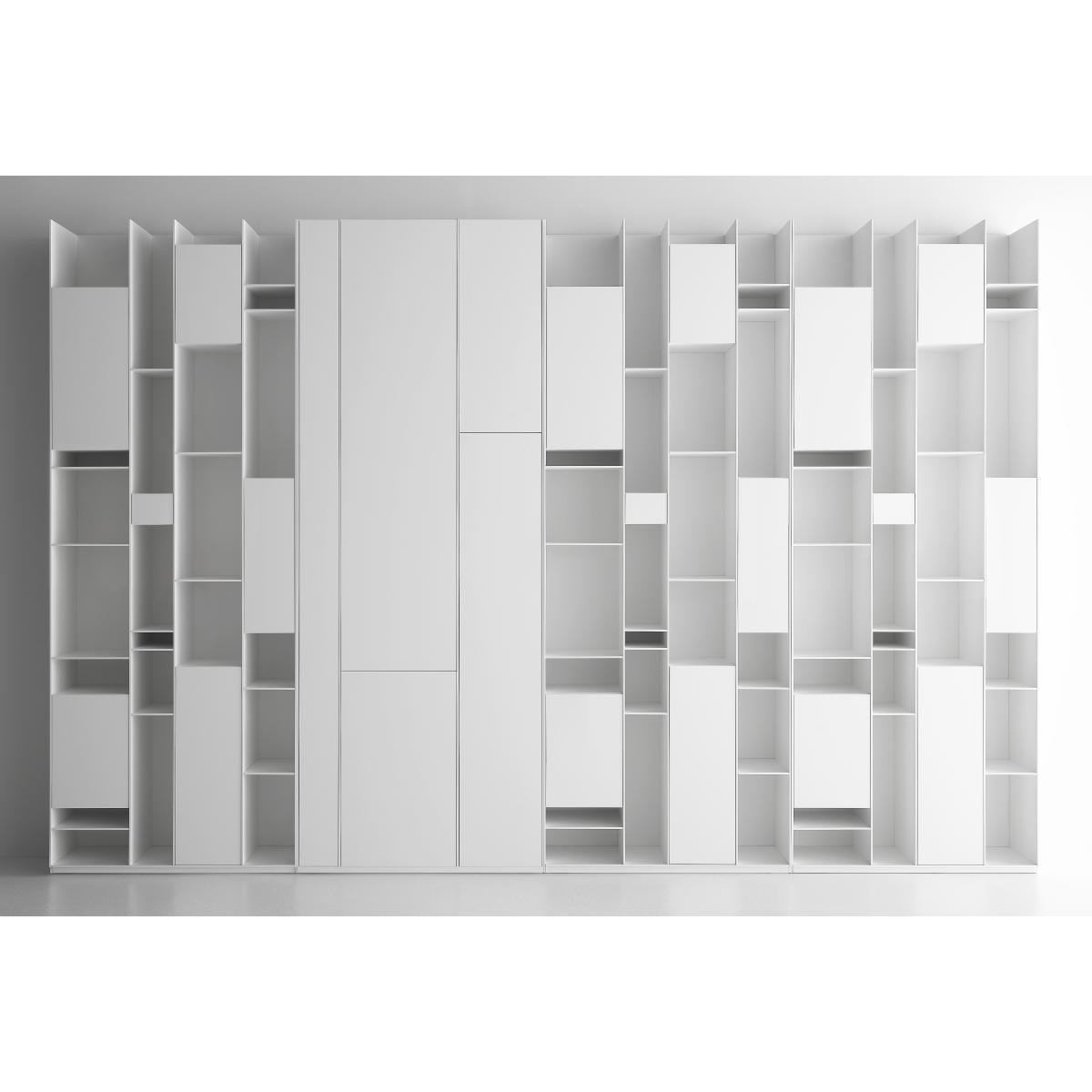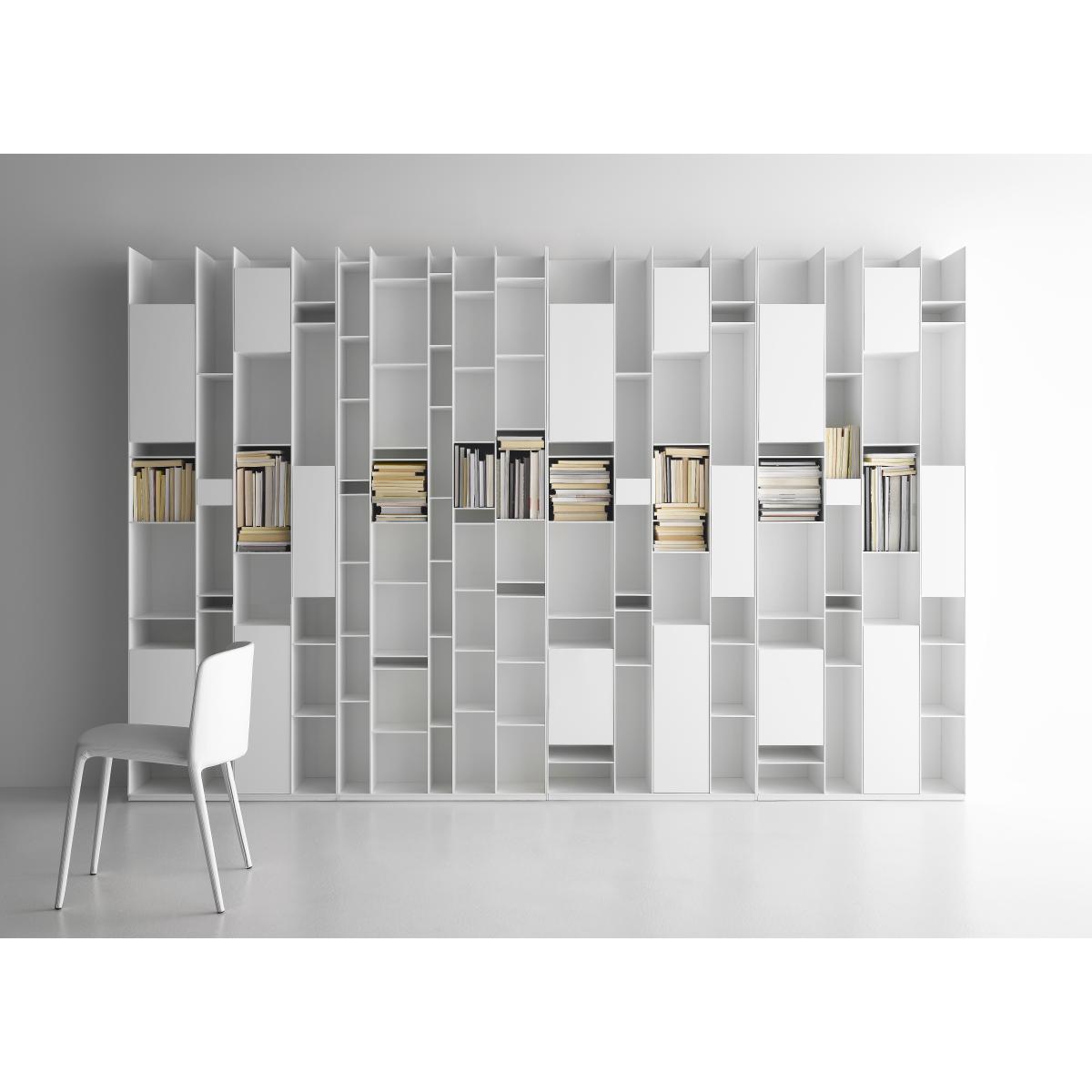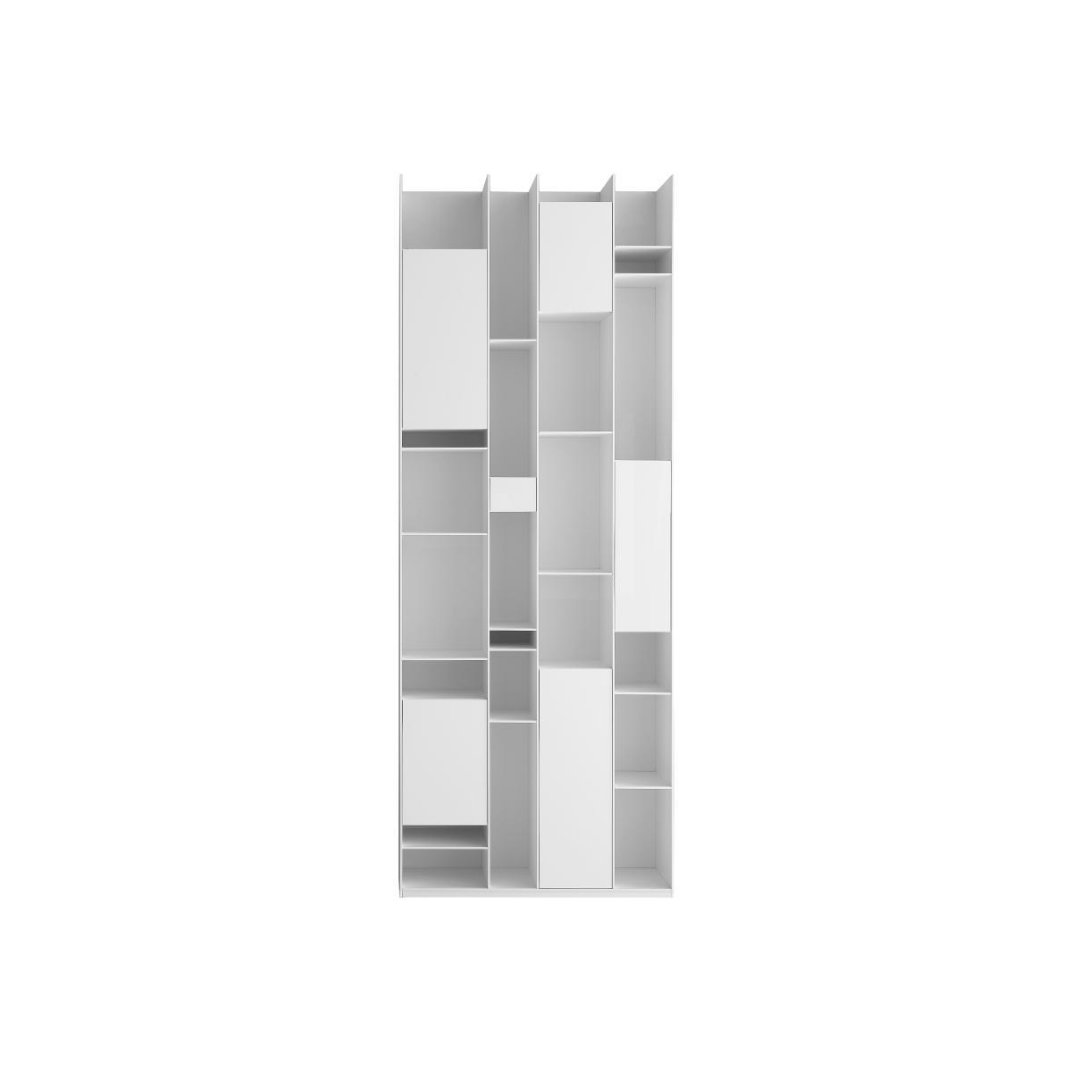 Random Box combines its predominant display function with the use as a storage unit. A bookcase made of medium-density wood fibreboards, in micro goffered white lacquer, uprights and shelves in thickness 6mm, doors in thickness 12mm. The back is made from white melamine-coated board. Open compartments, or closed by doors in standard size, and one drawer compartment. The large dims of the compartments and the new depth of 35 cm allow a functional use of the available space. By flanking more units, also with Random Cabinet or Random, large-sized configurations of strong impact can be created.