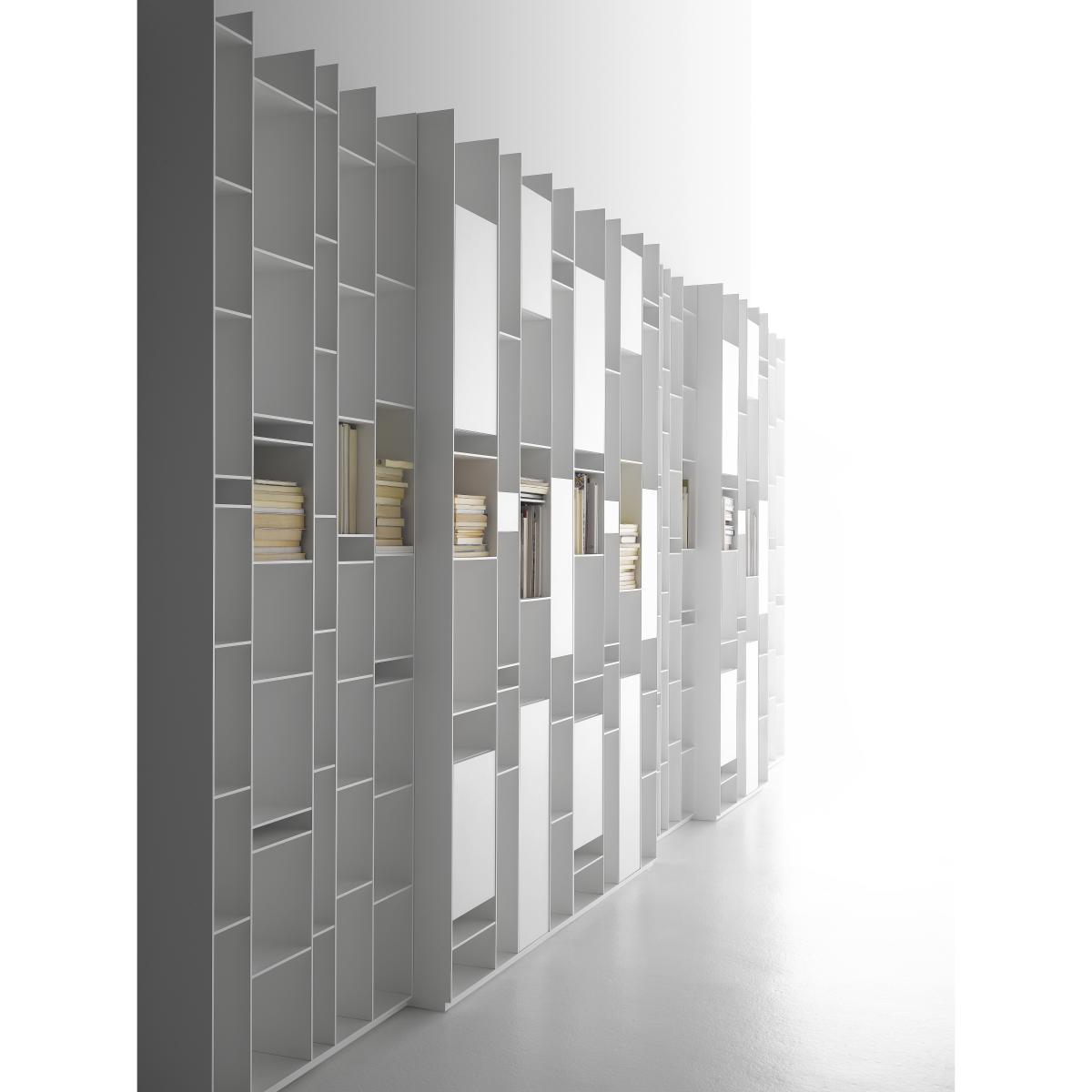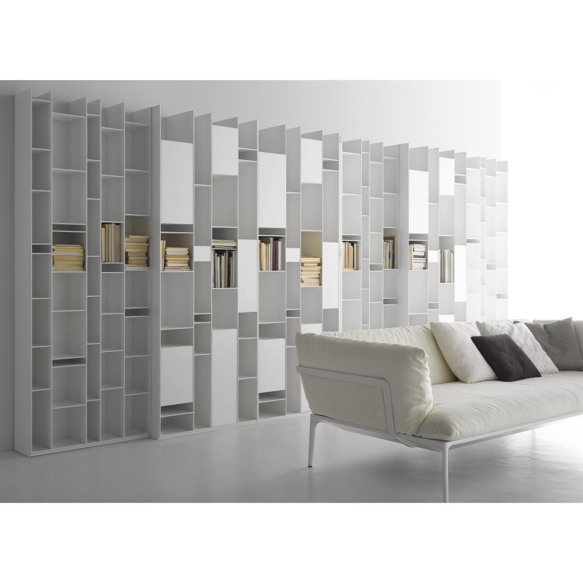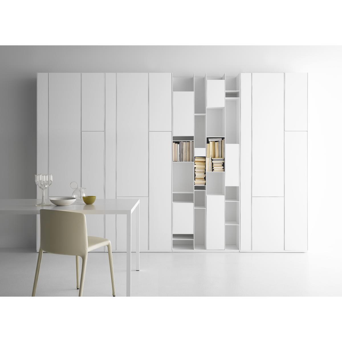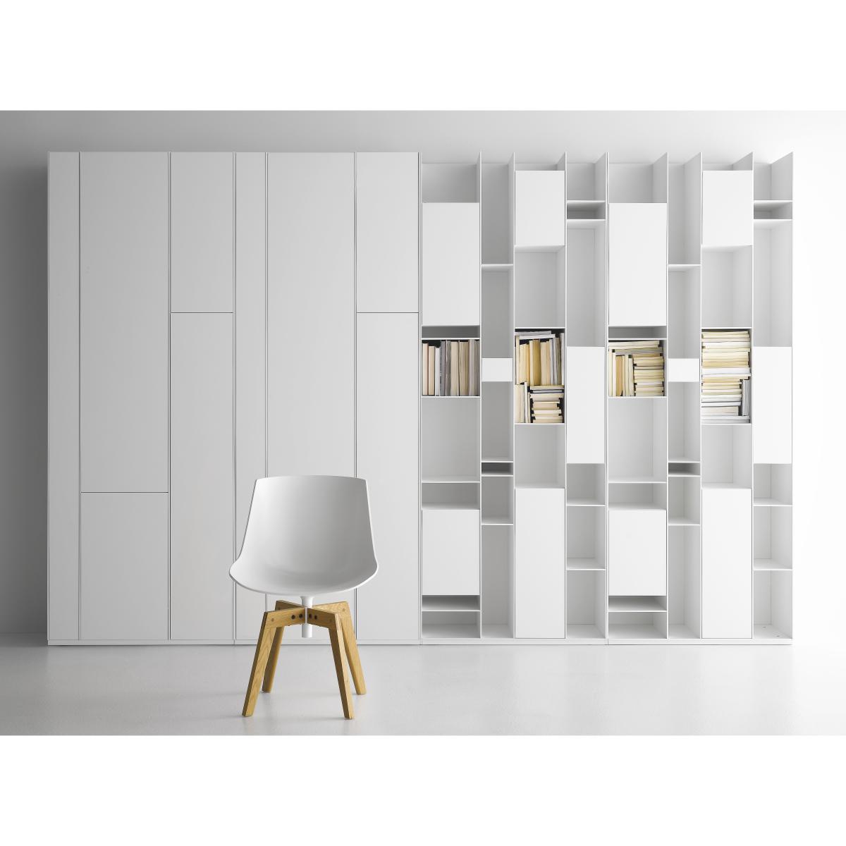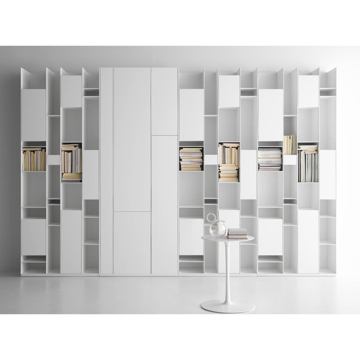 Random Box combines its predominant display function with the use as a storage unit. A bookcase made of medium-density wood fibreboards, in micro goffered white lacquer, uprights and shelves in thickness 6mm, doors in thickness 12mm. The back is made from white melamine-coated board. Open compartments, or closed by doors in standard size, and one drawer compartment. The large dims of the compartments and the new depth of 35 cm allow a functional use of the available space. By flanking more units, also with Random Cabinet or Random, large-sized configurations of strong impact can be created.