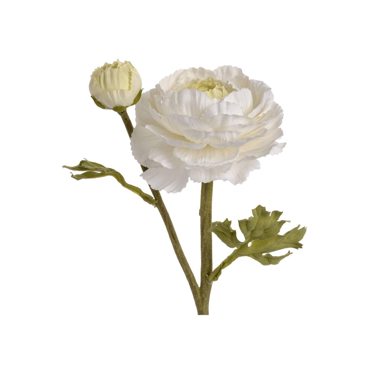 A single stem white ranunculous spray comprising one open flower head, one flower bud and ranunculous leaves on a textured stem.