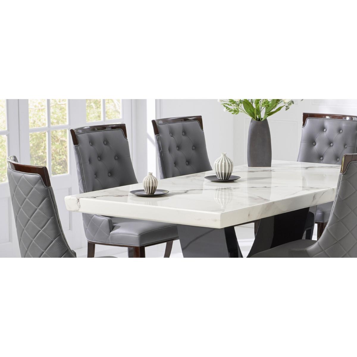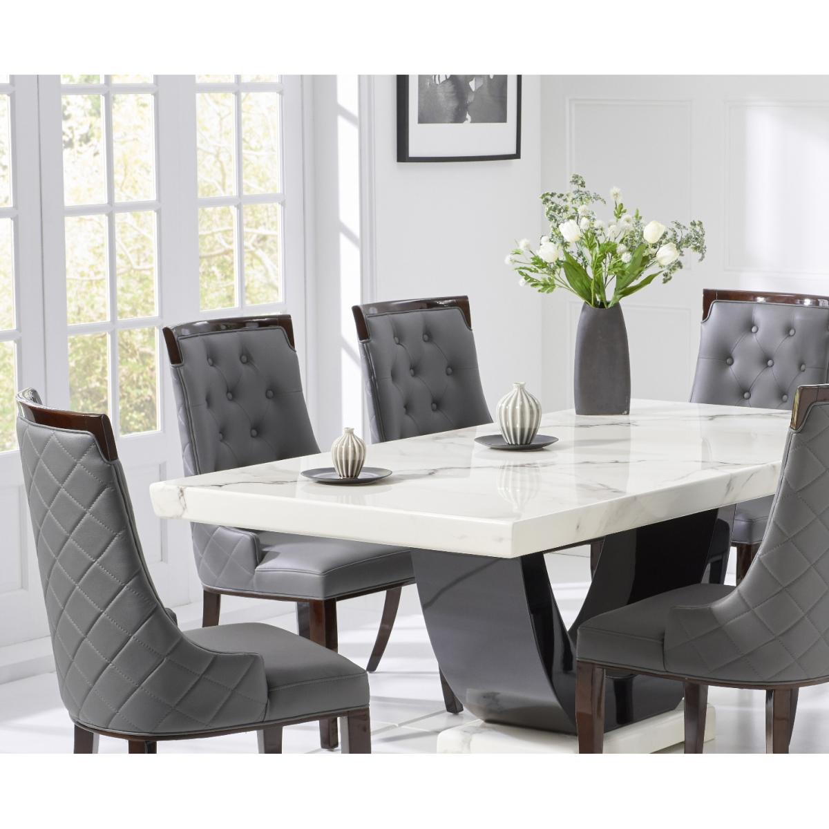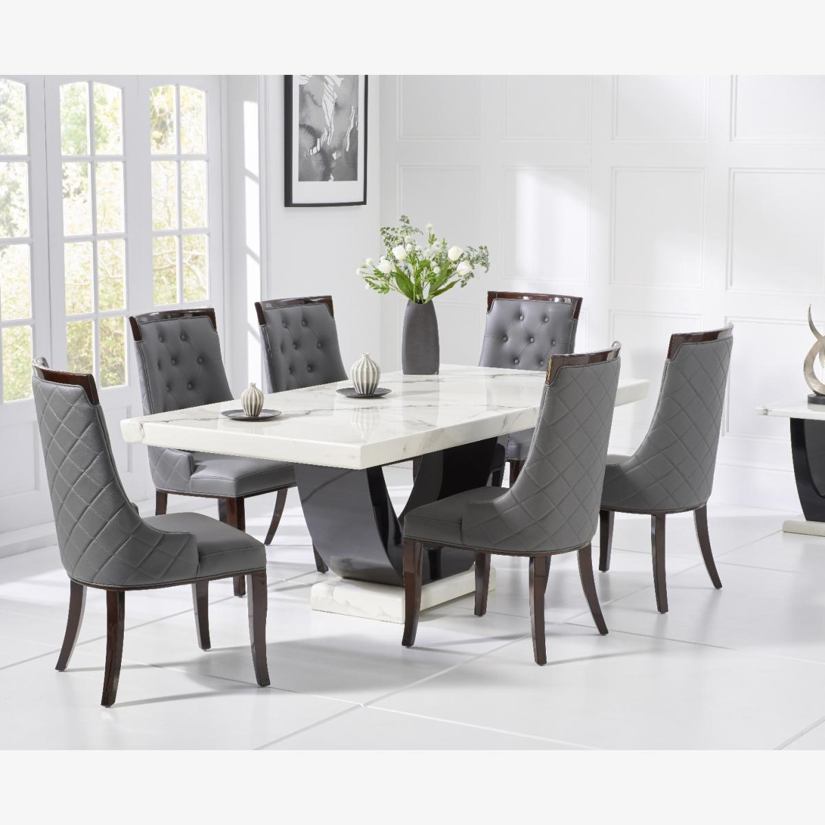 Raphael 200cm White and Black Pedestal Marble Dining Table with 6 Grey Francesca Chairs