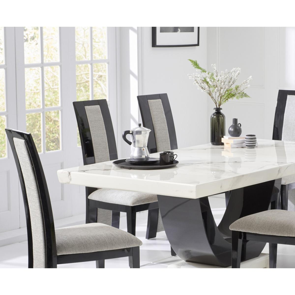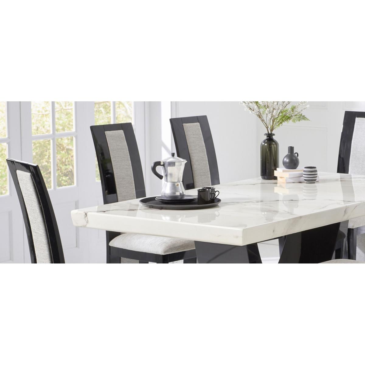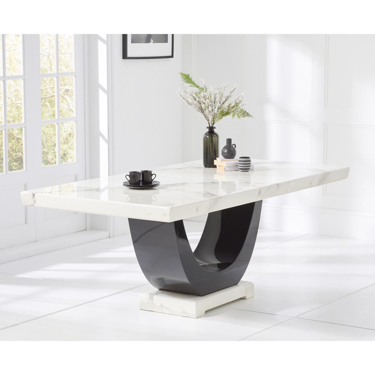 Stylish and practical, the Raphael 200cm White and Black Pedestal Marble Dining Table makes an impression in any home. Complemented beautifully by our solid wood Raphael Chairs, the large white marble dining table is an ideal setting for every occasion. Table Contemporary large white and black marble dining table. Seats up to 8 diners. Stunning curved pedestal design for a unique modern look. Natural marble pattern throughout and complete with a smooth high gloss finishUV resistant. Heat resistant to 50 degrees Celsius Additional Measurements:Table Top Thickness: 8cm. Pedestal Width: 40cm. Pedestal Depth: 65cm. Height to Underside of Table Top: 68cmChairs. Stunning solid wood dining chairs. Unique modern design with floor length backrests. High gloss finish to complement the dining table Black chairs feature grey fabric inlay and seat pad Brown chairs feature cream fabric inlay and seat padPLEAS. E NOTE: This item is eligible for GROUND FLOOR DELIVERY ONLY