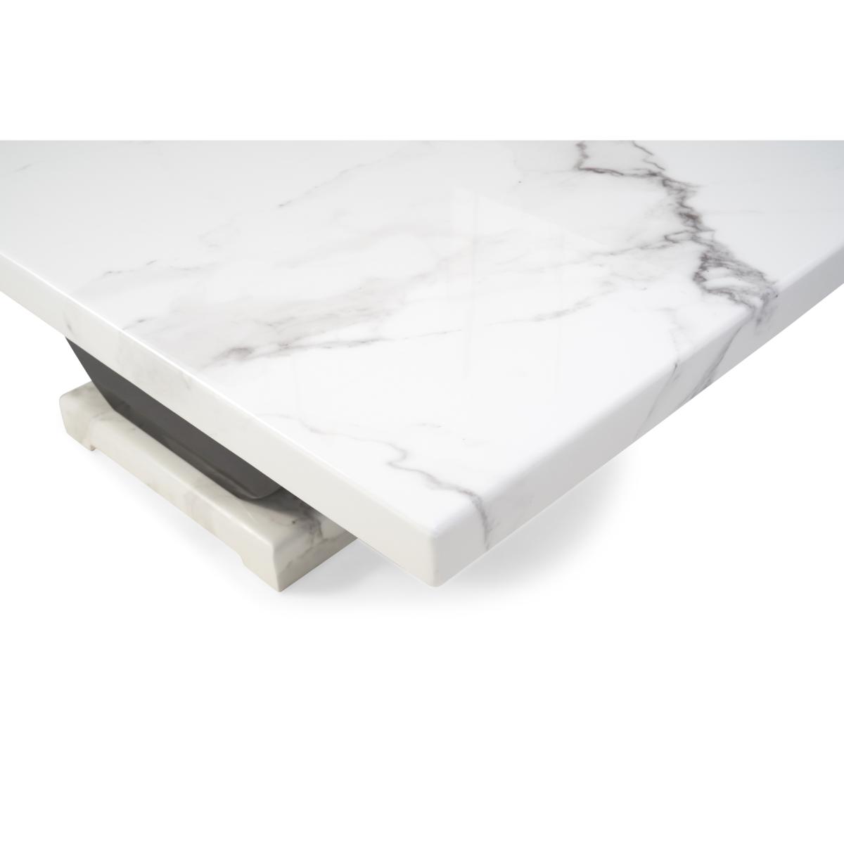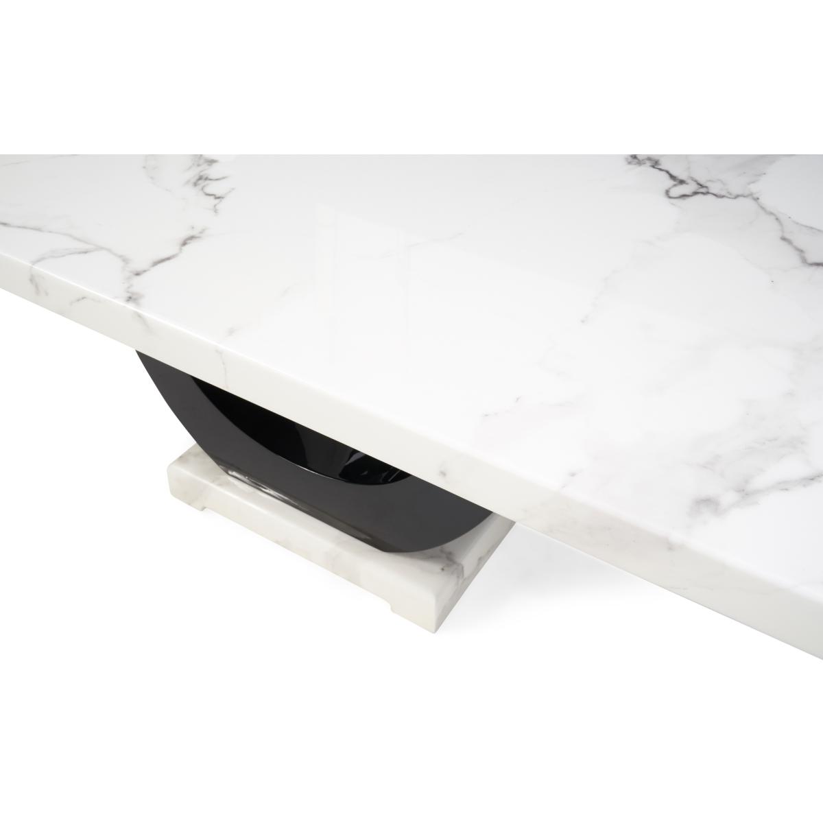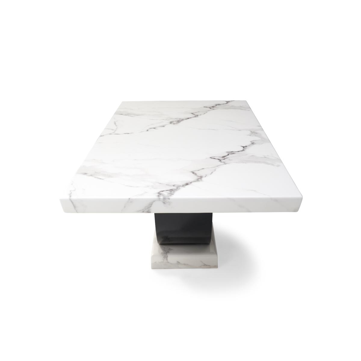 Stylish and practical, the Raphael 200cm White and Black Pedestal Marble Dining Table makes an impression in any home. Complemented beautifully by our solid wood Raphael Chairs, the large white marble dining table is an ideal setting for every occasion. Table Contemporary large white and black marble dining table. Seats up to 8 diners. Stunning curved pedestal design for a unique modern look. Natural marble pattern throughout and complete with a smooth high gloss finishUV resistant. Heat resistant to 50 degrees Celsius Additional Measurements:Table Top Thickness: 8cm. Pedestal Width: 40cm. Pedestal Depth: 65cm. Height to Underside of Table Top: 68cmChairs. Stunning solid wood dining chairs. Unique modern design with floor length backrests. High gloss finish to complement the dining table Black chairs feature grey fabric inlay and seat pad Brown chairs feature cream fabric inlay and seat padPLEAS. E NOTE: This item is eligible for GROUND FLOOR DELIVERY ONLY