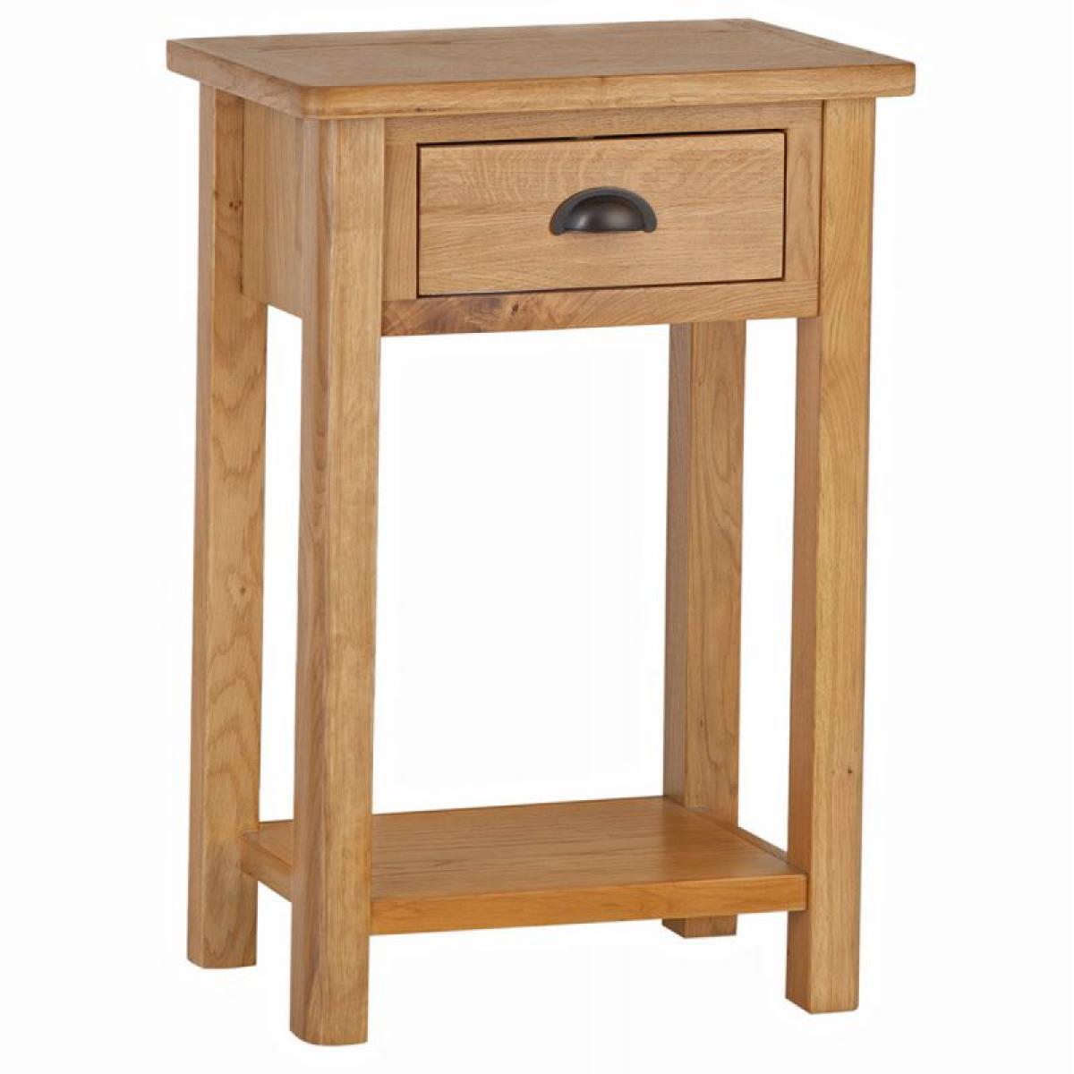 I love this piece because its rustic oak finish adds warmth and character, making it versatile for both traditional and contemporary interiors. It works particularly well in hallways, living rooms, or as an accent table in a bedroom. Its compact size makes it practical without sacrificing style, and the drawer provides handy storage for small essentials. For styling, try pairing it with textured accessories like woven baskets or ceramic vases, and consider placing a small lamp or a decorative tray on top to enhance its functionality and visual appeal. This table is a great addition to spaces that need a touch of natural, understated elegance.