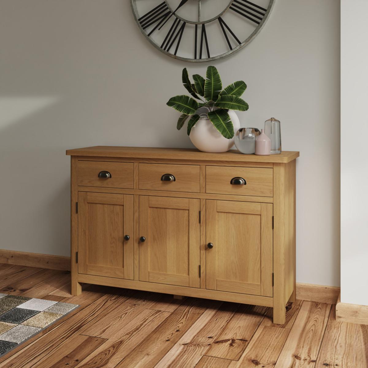I really like the Rara Rustic Oak sideboard for its warm, natural finish that effortlessly brings a cosy, inviting feel to any space. It works particularly well in both traditional and Scandinavian-inspired interiors, adding a touch of organic charm. For styling, I suggest keeping a minimal top with a few curated accessories like vases or candles to highlight its natural beauty without cluttering. Practical tips include utilising the drawers for cutlery or linens, while the cabinet space is perfect for larger items or everyday essentials. Its earthy tone makes it versatile enough to pair with both neutral and colour-rich schemes, making it a great all-rounder for living rooms, dining areas, or even a hallway.