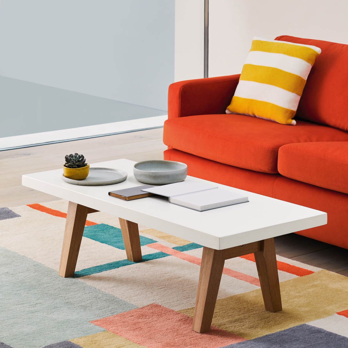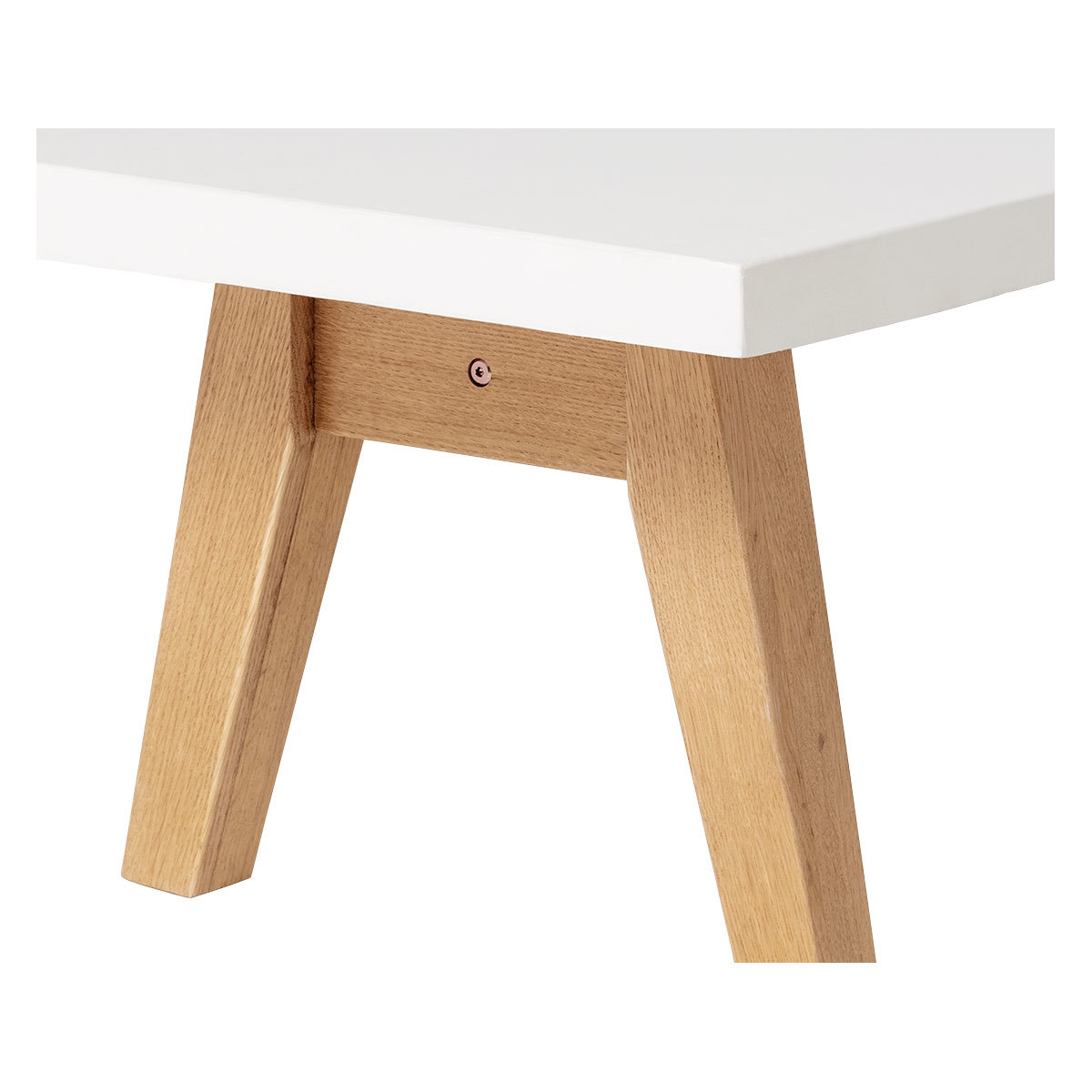 Chic and contemporary, the Rasmus white concrete and solid oak coffee table is a durable, statement design. On-trend, this table blends together the industrial feel of a white concrete top with the classic warmth of solid oak legs below to create a stand-out finish in your living room. Stain resistant, this coffee table is perfect for everyday use. Part of the Rasmus range, a dining table is available as well as a bench.