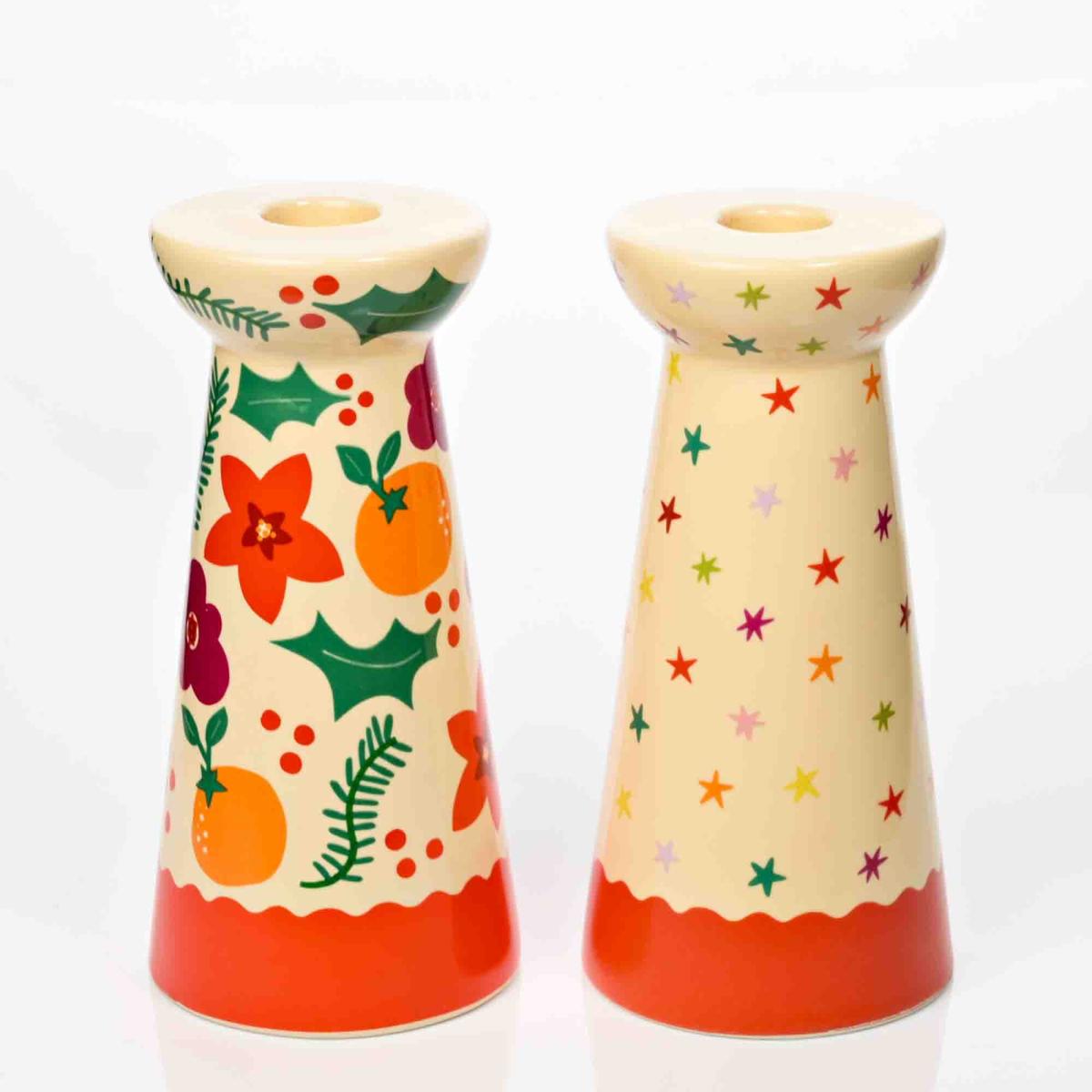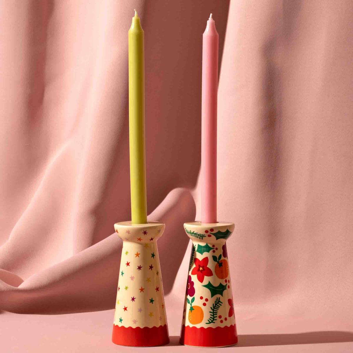 I really like this set of two candlesticks because of their vibrant, multi-coloured design, which makes them a fun and lively addition to various interiors. They work particularly well in eclectic and playful schemes, or as a cheerful accent in more neutral spaces. To style them effectively, consider placing these on a mantelpiece, side table, or even as a centrepiece on your dining table to add a pop of colour and a cosy ambiance. Mixing them with simple, understated accessories can help the colours really stand out, while pairing them with matching or complementary candles will enhance their visual appeal. Overall, they're a versatile choice for bringing a touch of brightness and personality into your home.