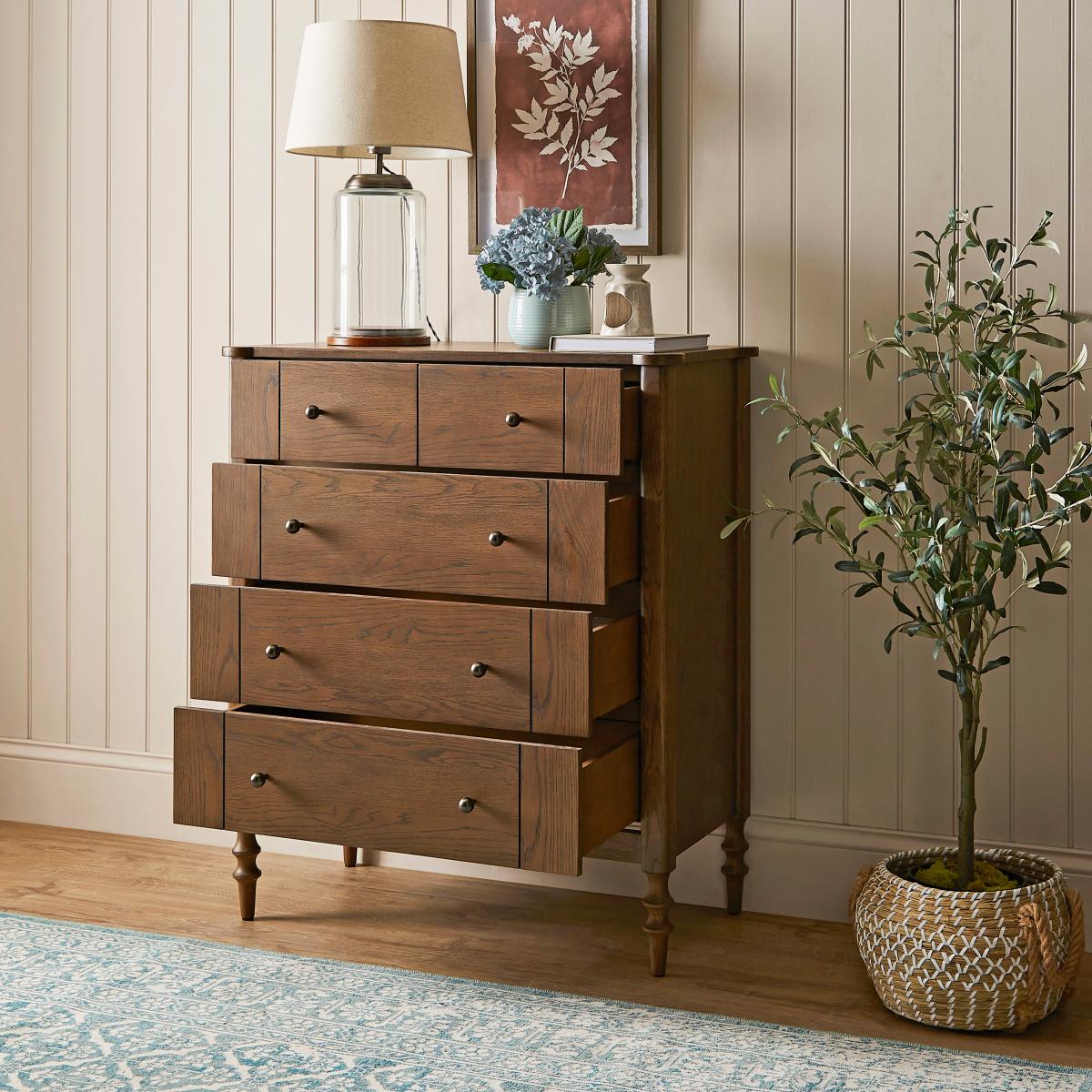 I particularly like how this light oak chest balances clean lines with a hint of traditional detail - the turned legs and simple knobs give it character without feeling fussy. It works equally well in a Scandi-inspired bedroom, a relaxed country scheme or a contemporary hallway where extra storage is needed. For styling, keep the top relatively uncluttered: a slim table lamp, a small stack of books and a single vase of flowers or a sculptural object. Inside, use drawer organisers or woven baskets to make the most of the five drawers. If you’re placing it against a blank wall, hang a round mirror or framed artwork above to complete the look.