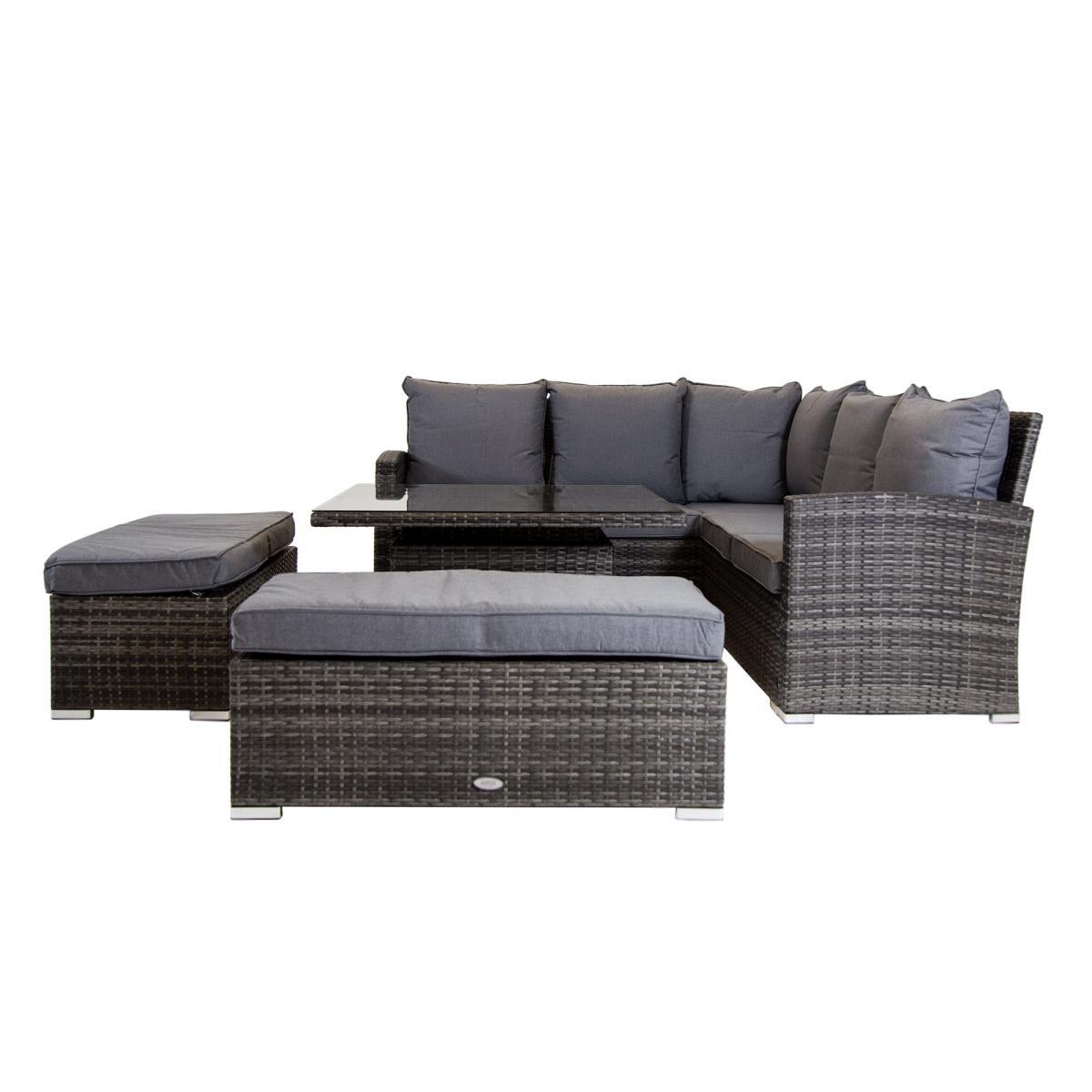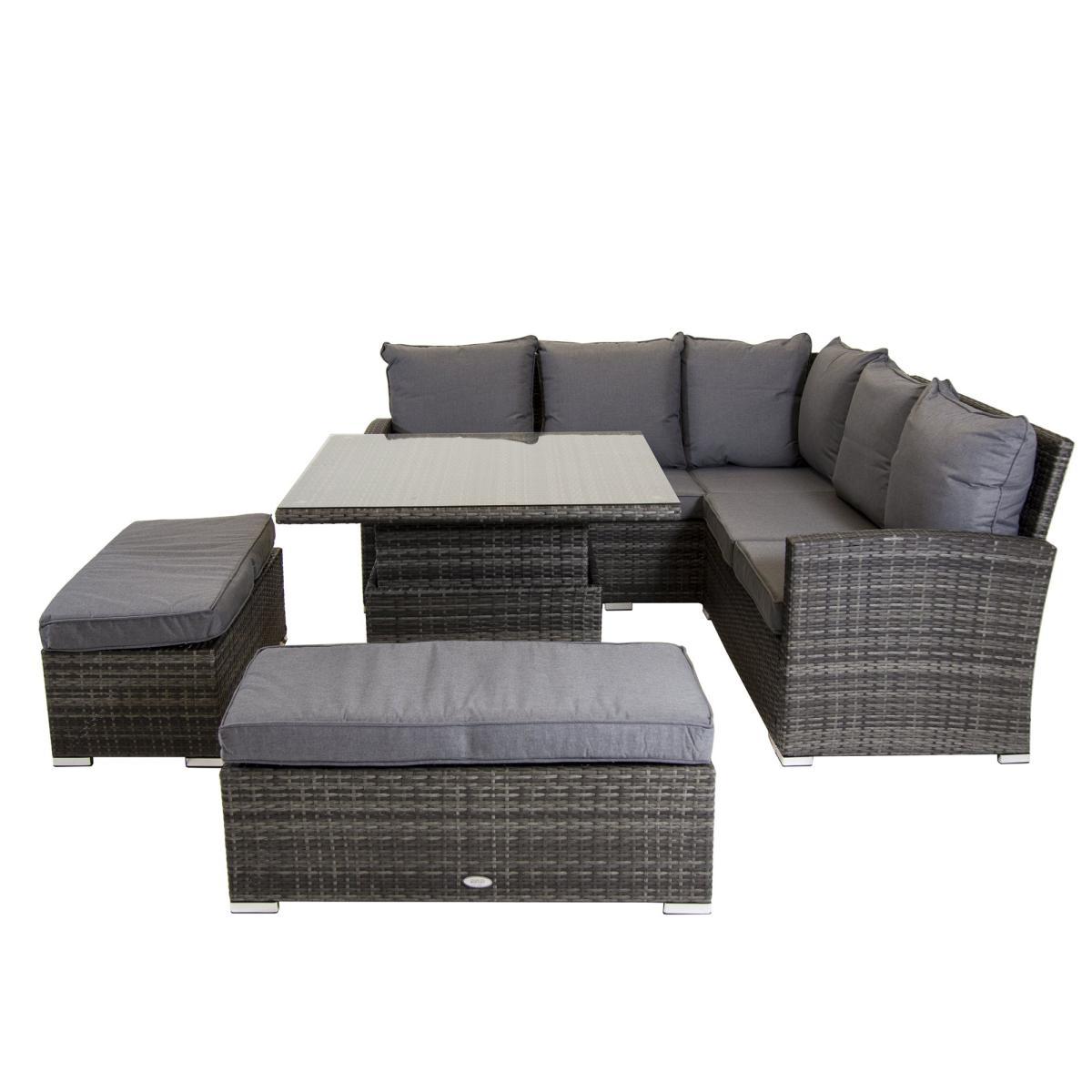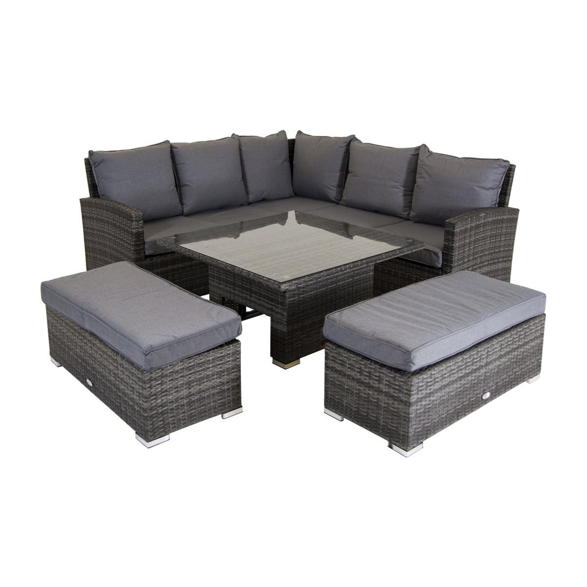Relax outdoors in luxurious comfort with our contemporary rattan lounge set, perfect for adding a stylish touch to any garden or patio. A perfect set for four to eight people, this set comprises of a large corner sofa, 2 large stools and cushions for added support. This set also features a large table with an adjustable height perfect for a relaxed dining experience. Made from a flat weave variegated rattan which is weatherproof, this durable Rattan set can withstand harsh elements. Please note - This product will be delivered on a pallet, which cannot be disposed of by the courier team. The recipient will be responsible for the disposal of the pallet.