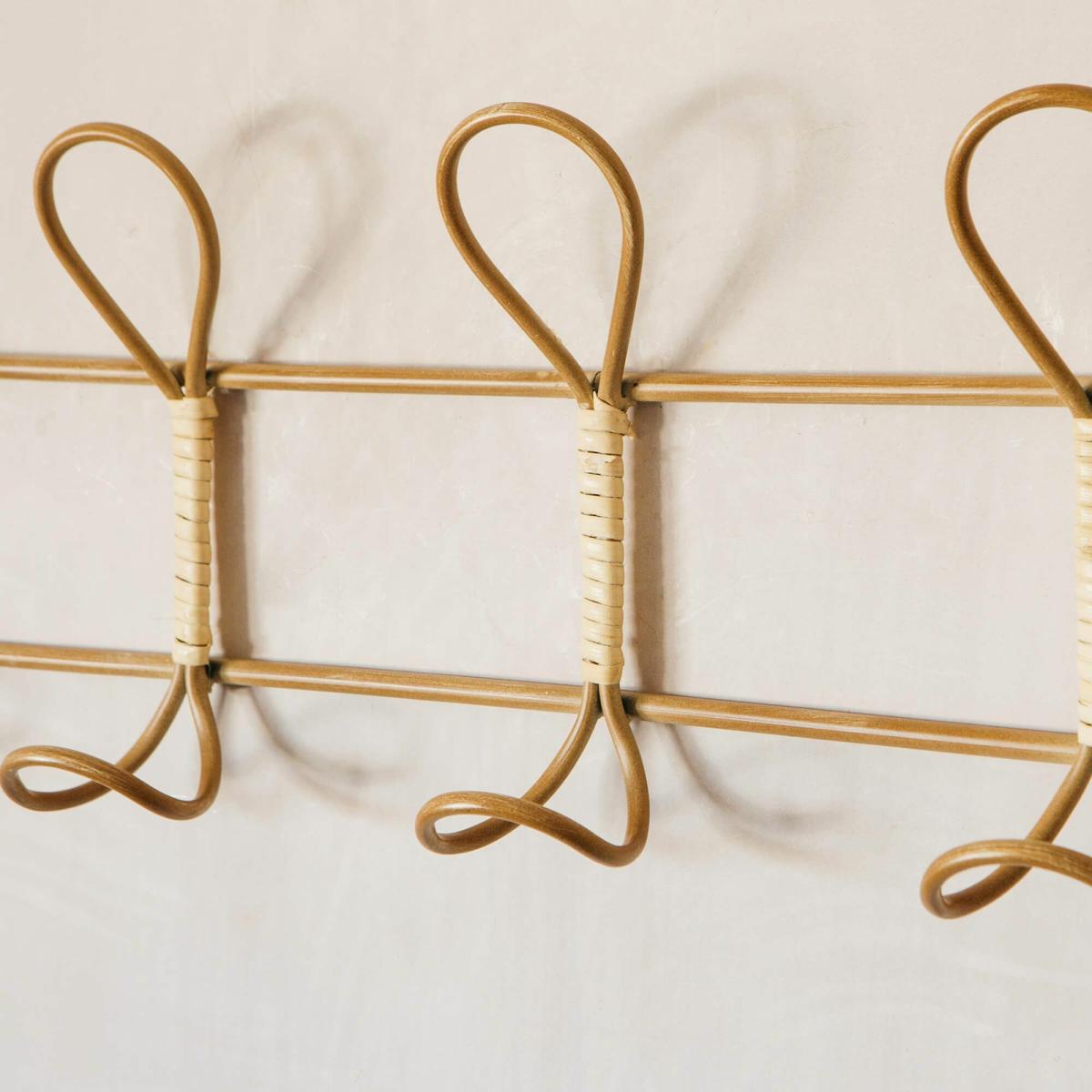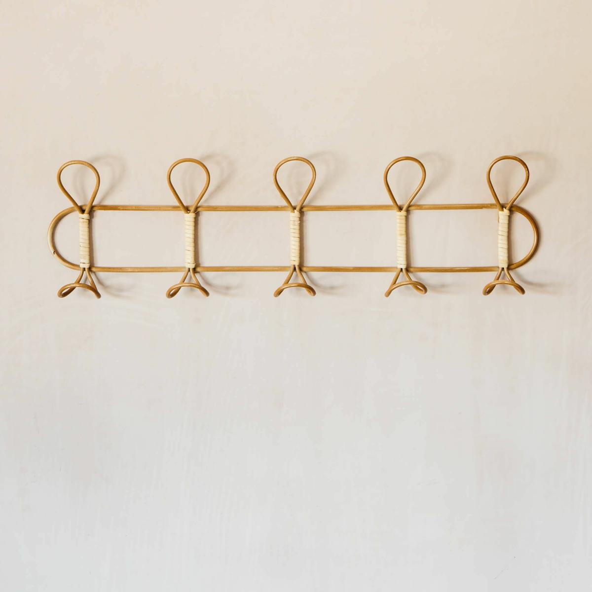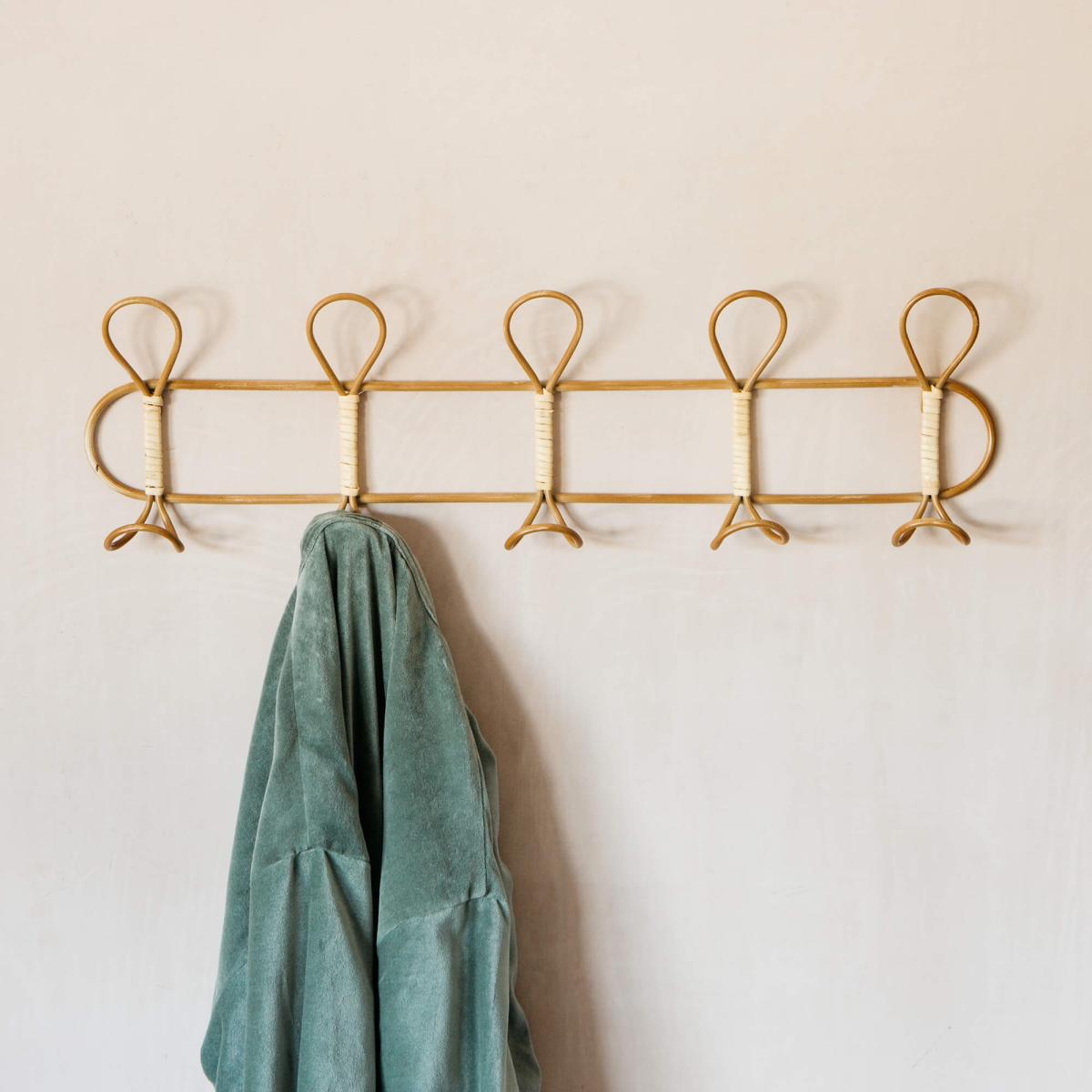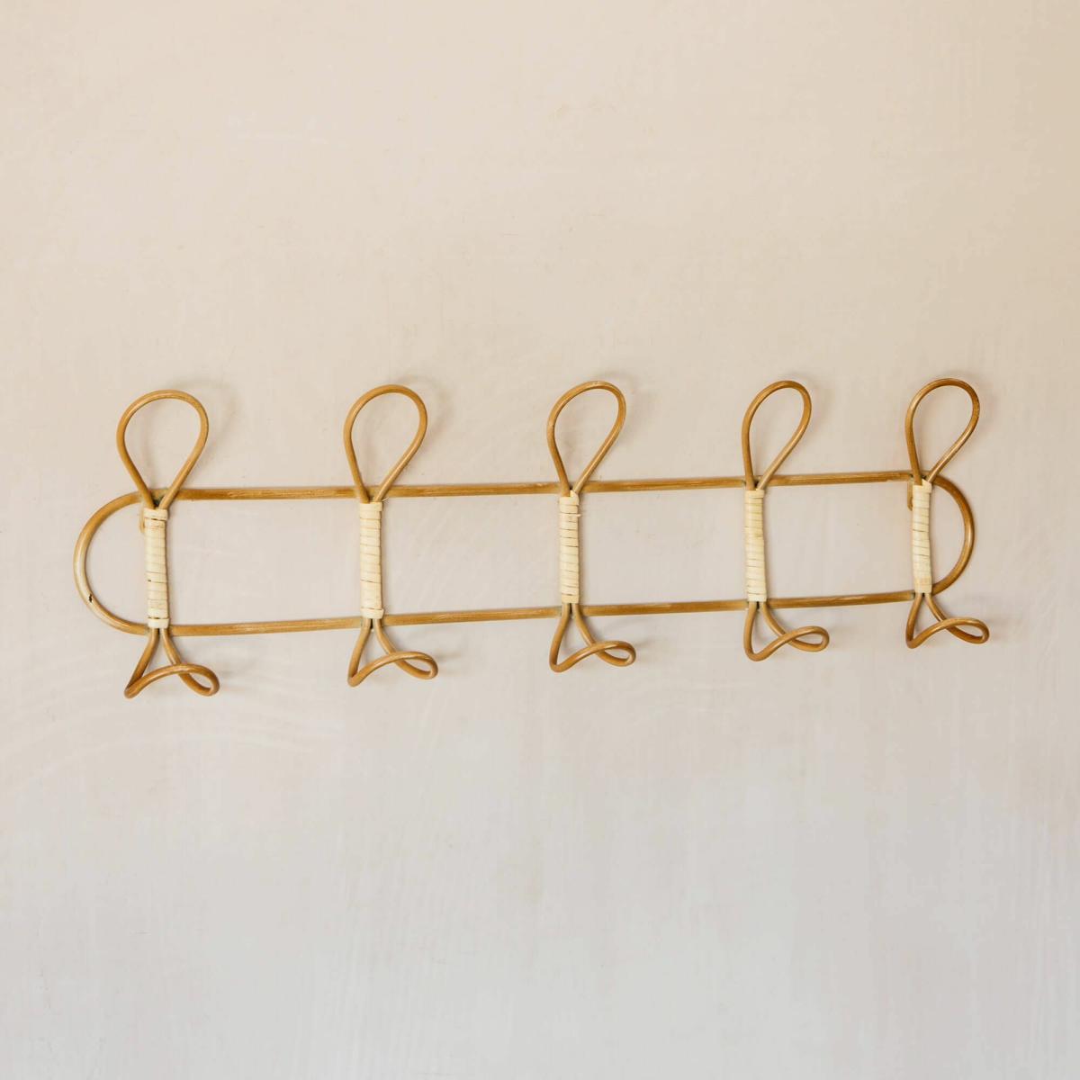 A modern rustic addition to any home, this set of hooks is made from iron and rattan for a delicately crafted look. Featuring five hooks, you can hang dried flowers, woven baskets or silken kimonos to create a curated display.