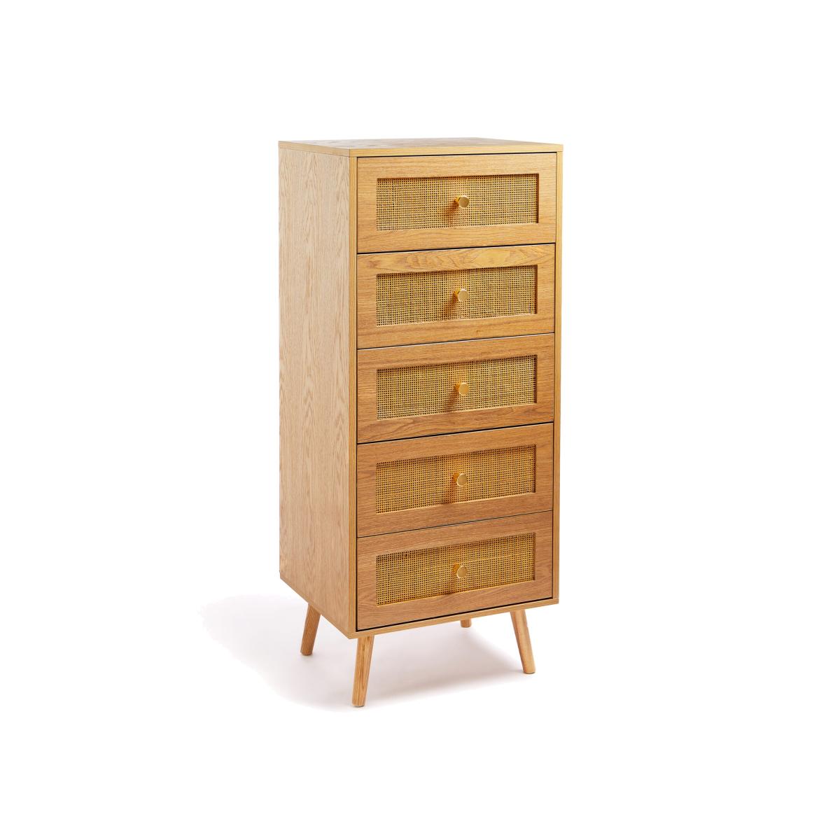 Add a dash of bohemia to your bedroom with the Von Haus Sienna chest of drawers. Adorned by elegant handles, the charming rattan-fronted bedside drawers are elevated by a touch of luxe. Both undeniably characterful and gorgeously dainty, level up your bedroom, lounge, or home office. Standing atop tapered rubber wood legs, use the five storage drawers to organise your bedding, blankets, and extra clothes, whilst displaying your fave photos and trinkets on the top surface. Finished with a durable wood-effect melamine coating for a natural aesthetic, your slimline rattan dresser will add an inviting warmth to any room, striking a unique balance between minimalist Scandi design and shabby-chic detailing. Coordinate your bedroom furniture in woven style with the Sienna range.