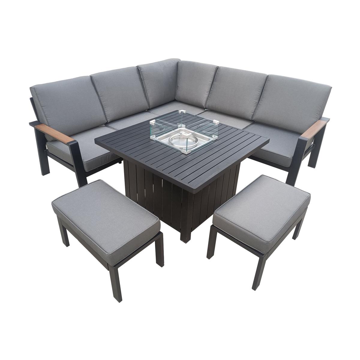 This stunning flat weave rattan furniture is the ideal furniture to combine relaxation and al fresco dining, no matter the weather. This is down to the stunning rattan casual dining table which includes a gas firepit in the centre of the table. The firepit will help to keep you and your guests warm, as well as adding heat and light to your outdoor space. This deluxe corner group, and 2 padded footstools offer space for up to 7 guests. The furniture itself is crafted from powder coated aluminium frames which are fully rustproof, and high quality PE synthetic rattan which is fully weatherproof and can be left outside all year round without damage from UV rays, or cold weather. This set comes with padded cushions included, we recommend the cushions are stored indoors when not in use, however the cushion covers can be machine washed should they become dirty.