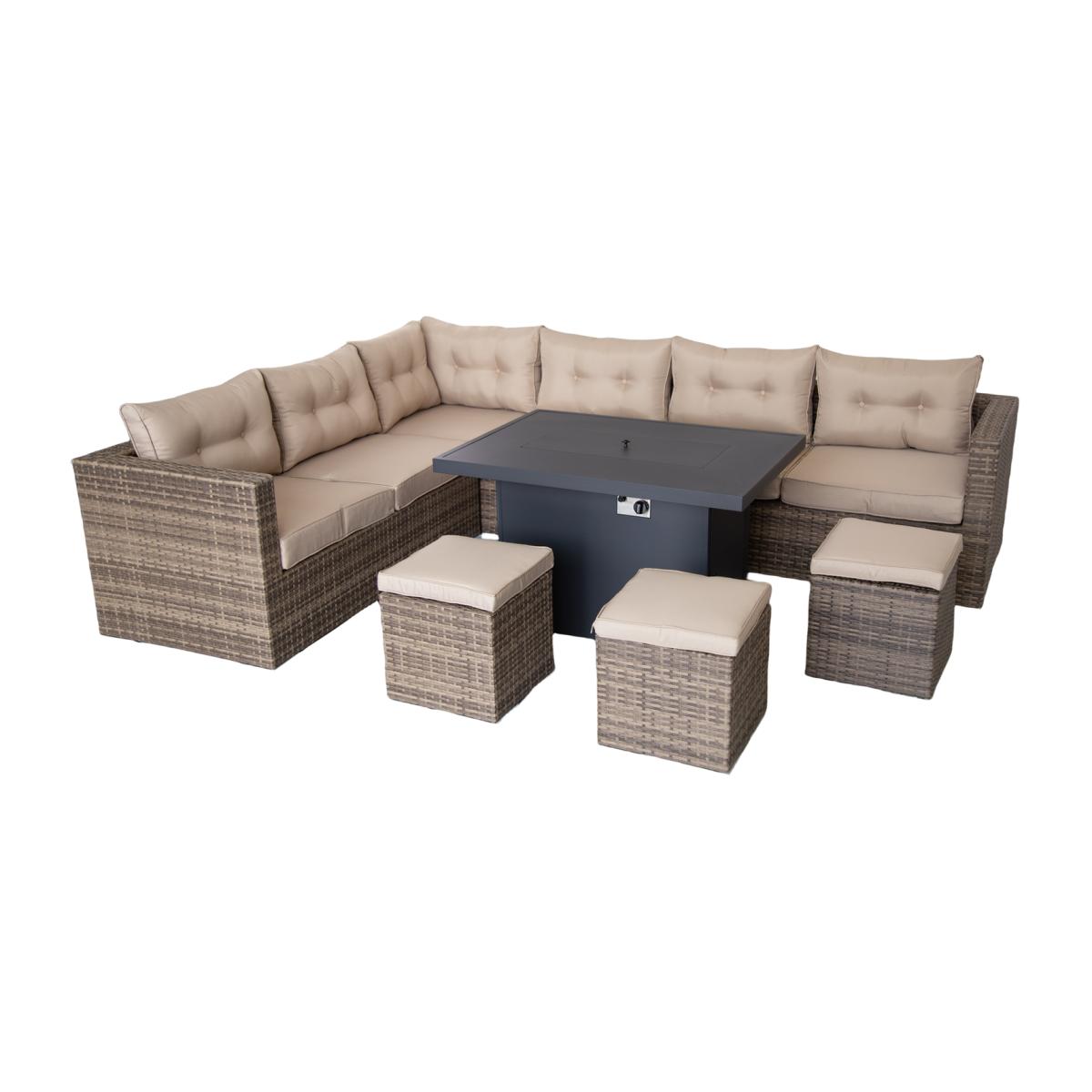 Rattan Corner 9 Seater Fire Pit Table Set - Nature