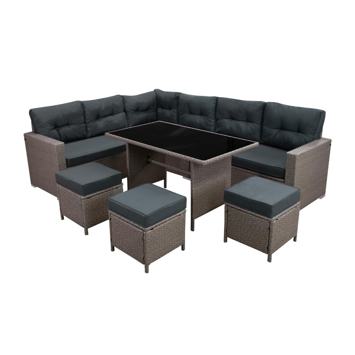 Experience luxury in its finest form with our stunning 9 seater rattan furniture corner set from the sensational Jardi range. Designed for maximum style and comfort, this exquisite dining set is made up of a corner sofa, 3 x stools and a glass top table. Able to comfortably seat nine people, this set is sure to be the perfect centrepiece for any garden party or dining al fresco. Finished in a striking grey and complemented with extra thick beautiful grey cushions, the set brings a modern and luxurious touch to your garden. With the addition of a protective UV-layer, you can be assured your furniture will be shielded from the elements all year round, helping to maintain its beautiful colour. With practicality in mind, the waterproof cushions have removable and washable covers for your ease and convenience to keep them looking like new. And with the high-quality rain cover provided you can protect your furniture in wet and rainy conditions, no need to move your dining table and chairs indoors! This Jardi rattan corner dining set is a low maintenance, stylish option which will always add a touch of sophistication to any patio or outdoor space. Transform your garden into a personal paradise and be the envy of all your friends and neighbours as you enjoy your premium seating area.