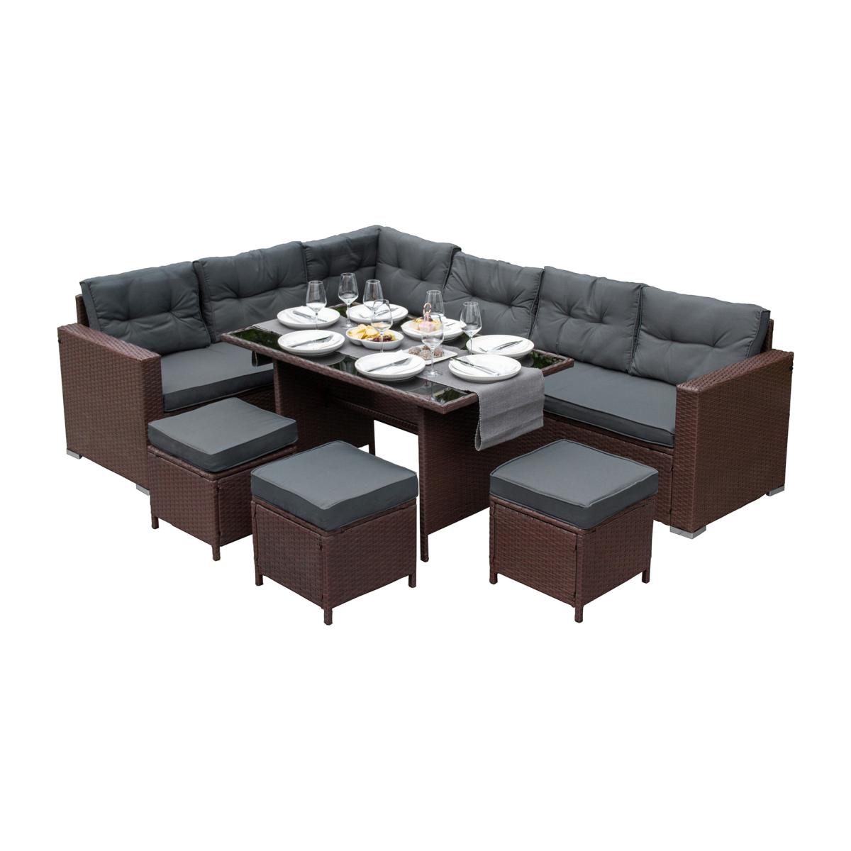 Experience luxury in its finest form with our stunning 9-seater rattan furniture corner set from the sensational Jardi range. Designed for maximum style and comfort, this exquisite dining set is made up of a corner sofa, 3 x stools and a glass top table. Able to comfortably seat nine people, this set is sure to be the perfect centrepiece for any garden party or dining al fresco. Finished in a striking brown and offset with extra thick beautiful grey cushions, the set brings a modern and luxurious touch to your garden. With the addition of a protective UV layer, you can be assured your furniture will be shielded from the elements all year round, helping to maintain its beautiful colour. With practicality in mind, the waterproof cushions have removable and washable covers for your ease and convenience to keep them looking like new. And with the high-quality rain cover provided you can protect your furniture in wet and rainy conditions, no need to move your dining table and chairs indoors! This Jardi rattan corner dining set is a low-maintenance, stylish option which will always add a touch of sophistication to any patio or outdoor space. Transform your garden into a personal paradise and be the envy of all your friends and neighbours as you enjoy your premium seating area. Box Contents:1 x Spacious 9 Seater L Shape Sofa3 x Comfortable Stools1 x Luxurious Glass Topped Table1 x Complete Set of Seat & Back Cushions1 x Protective Rain Cover