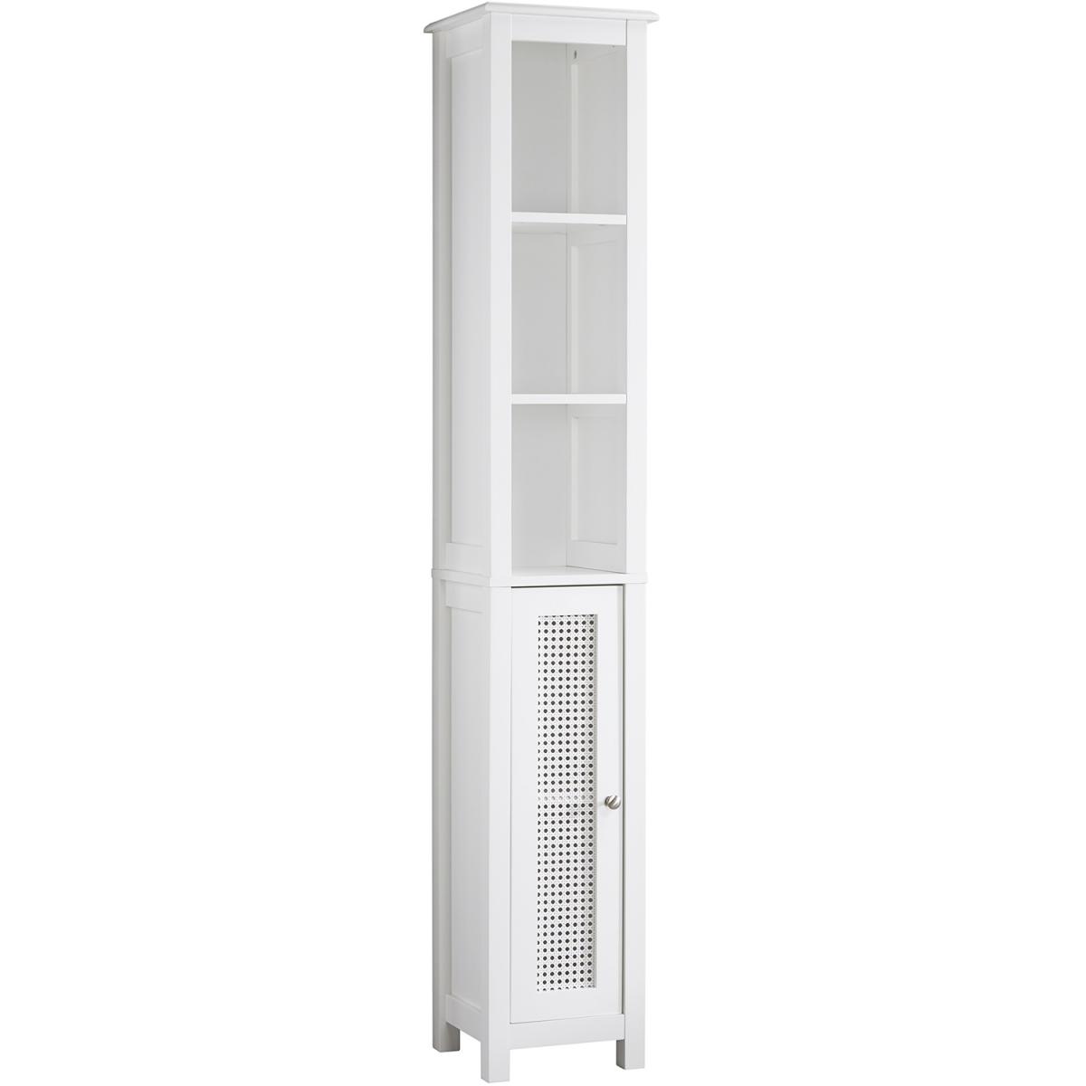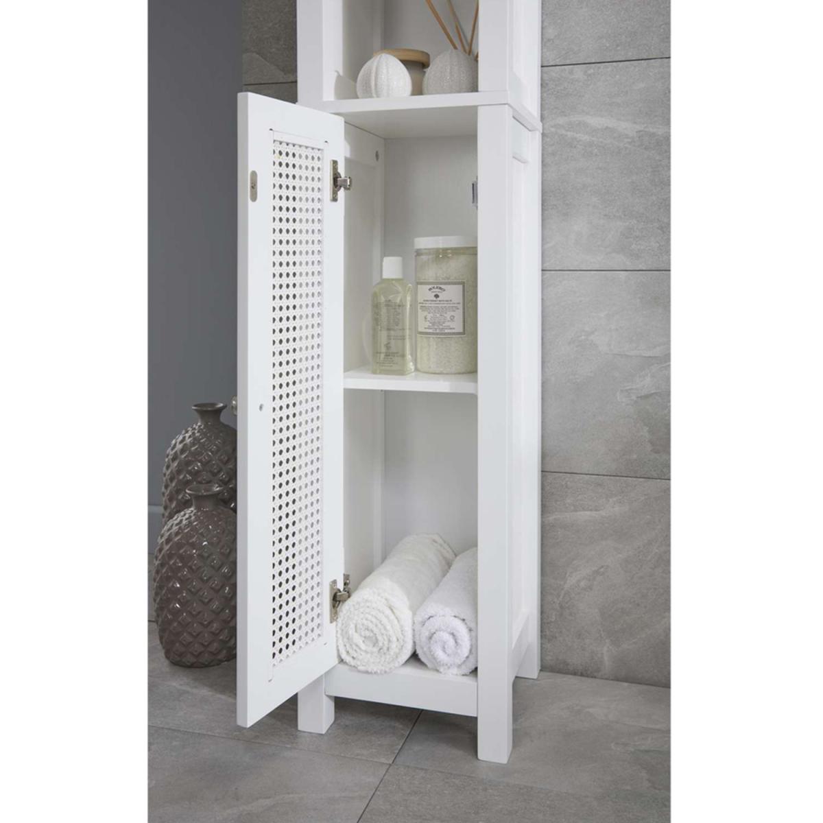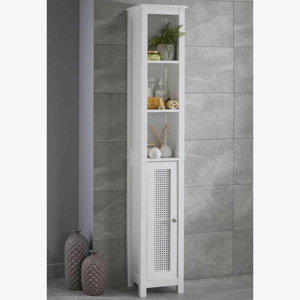 The Rattan Detail Tallboy Cabinet with Fixed Shelves in Grey can upgrade your bathroom in no time with distinctive vintage designs. Offering a stylish yet practical storage solution for your bathroom, this tallboy cabinet features a cupboard door to the bottom half with two inner shelves and 3 visible shelves towards the top. Complete with a matte grey finish, the bathroom unit is the perfect addition to any bathroom, or alternatively any room around your home, in need of storage space.
