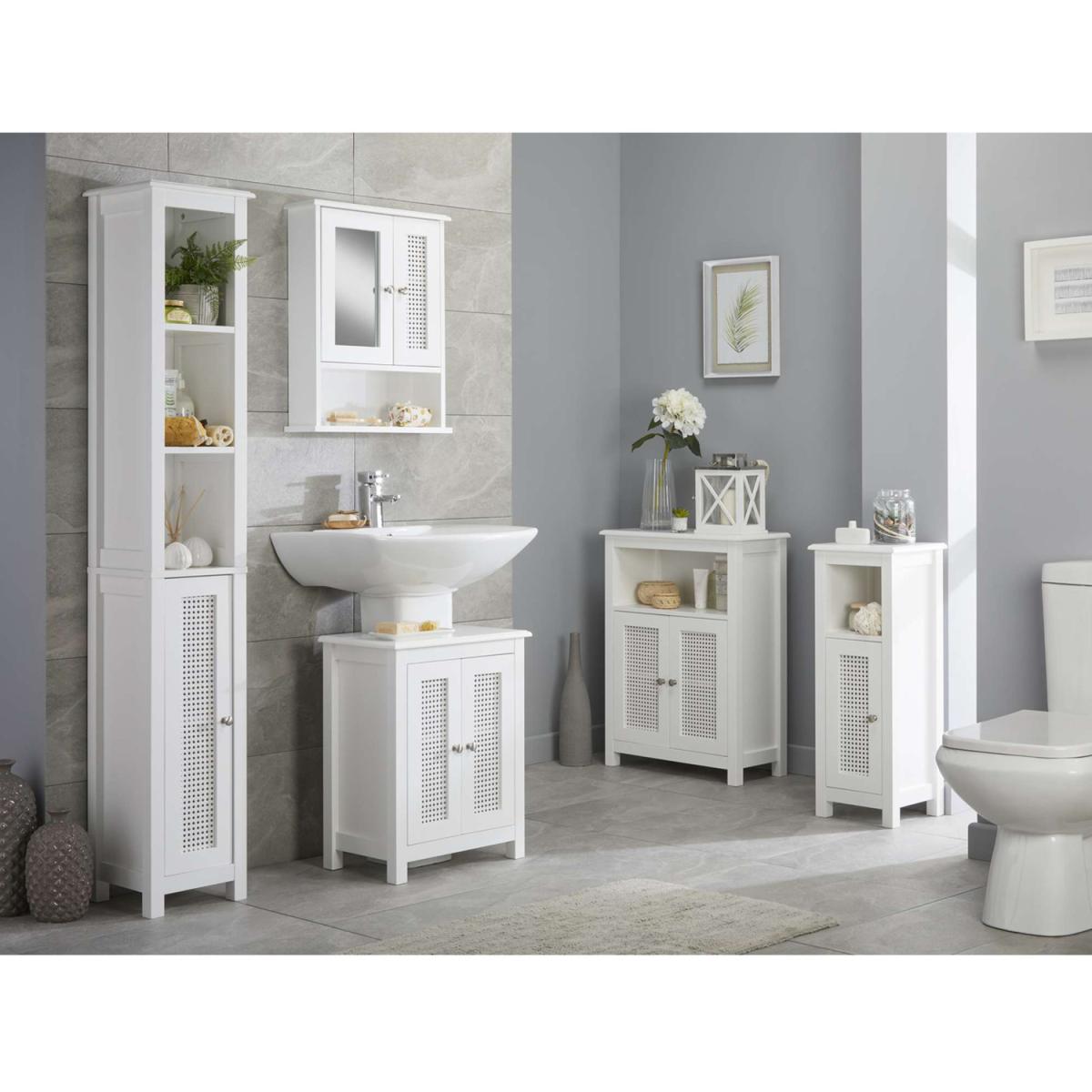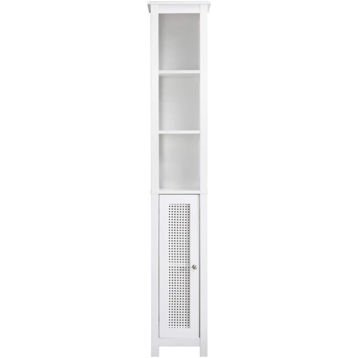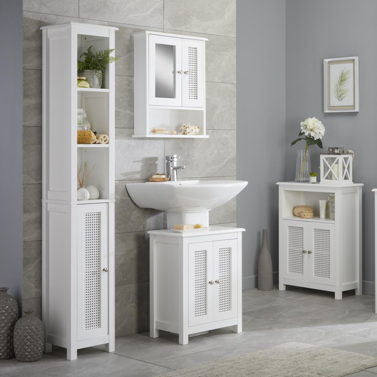 The Rattan Detail Tallboy Cabinet with Fixed Shelves in Grey can upgrade your bathroom in no time with distinctive vintage designs. Offering a stylish yet practical storage solution for your bathroom, this tallboy cabinet features a cupboard door to the bottom half with two inner shelves and 3 visible shelves towards the top. Complete with a matte grey finish, the bathroom unit is the perfect addition to any bathroom, or alternatively any room around your home, in need of storage space.
