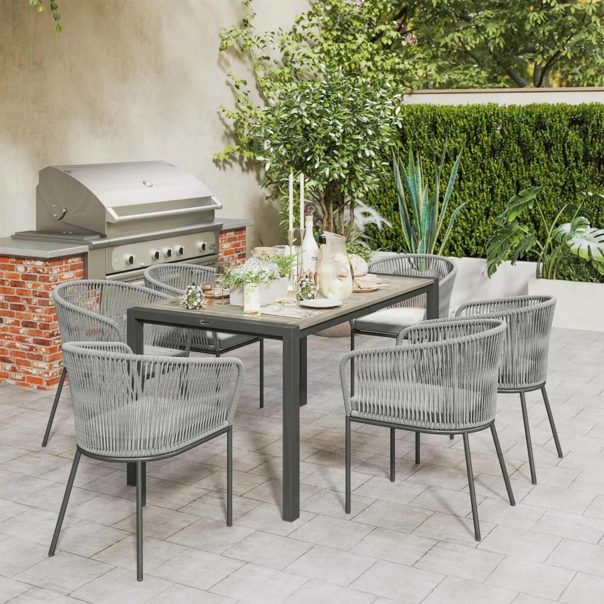 Transform your garden into a blissful dining oasis with this stunning garden table and chairs. This 7-piece outdoor garden furniture set, featuring six comfy chairs and a chic acacia wood-topped table, is a masterpiece in design. Crafted from all-weather PE rattan and a rust-resistant steel frame, it pairs durability with elegance, ensuring your outdoor gatherings are both stylish and comfortable. Rattan Dining Set - Grey