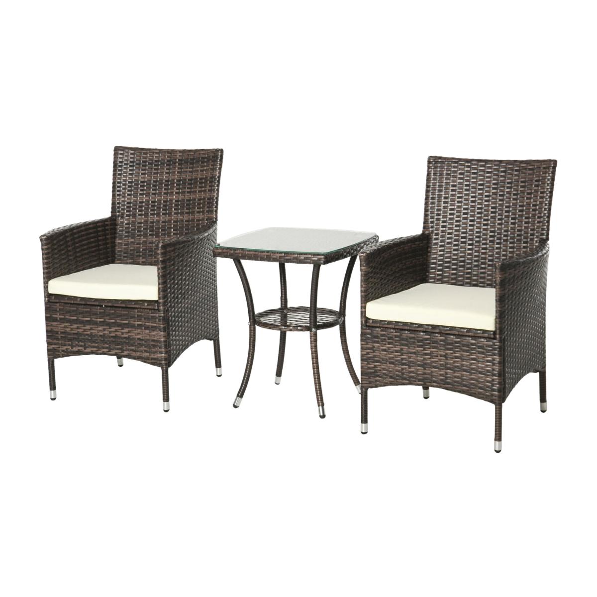 This outdoor bistro set is great for any patio, garden, porch and similar spaces. Frames of the rattan bistro set is made from powder coated steel mean a strong structure, wrapped in plastic PE rattan wicker for garden rattan style. UV and water resistant. Matching table gives a handy side surface, with a safe and sleek glass top. Repeat and use, season after season. Rattan Garden Bistro Set Table and Chairs - Brown