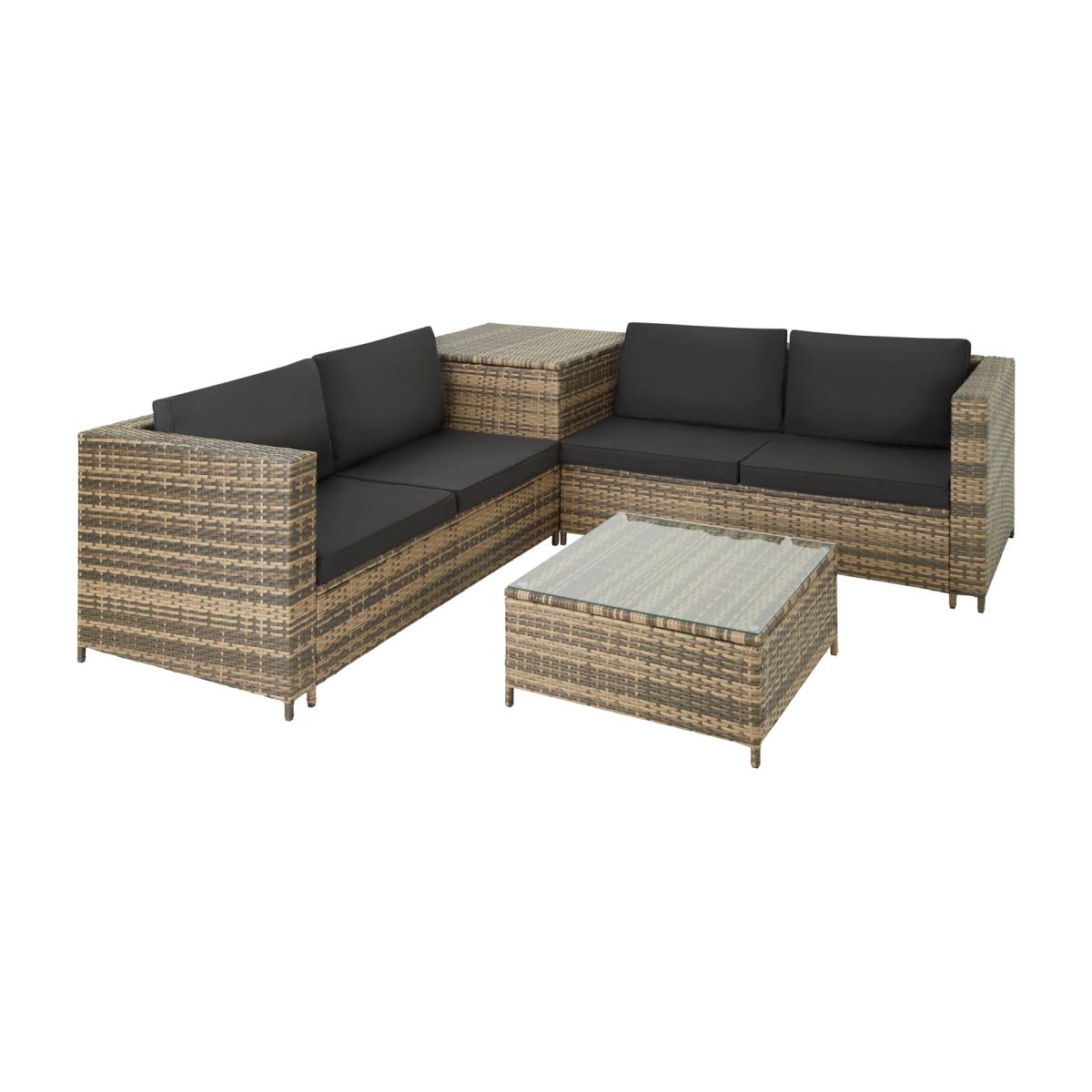 Achieve your own oasis of wellness with this versatile rattan garden furniture sofa seater set from tectake. Freely combinable, the individual elements of this robust set give you a high level of flexibility. Thanks to the outdoor sets subtle look, this elegant furniture will easily complement any environment. Its extra-thick cushions mean that you are provided with optimum comfort. The two sofas can be combined to create a perfect corner set, or arranged in alternative ways depending on the available space. The practical storage box provides the perfect place to keep extra accessories, whilst the table allows you to enjoy an outdoor dining experience. Reserve the best seat of the season for your home with this Siena rattan garden furniture set from tectake.