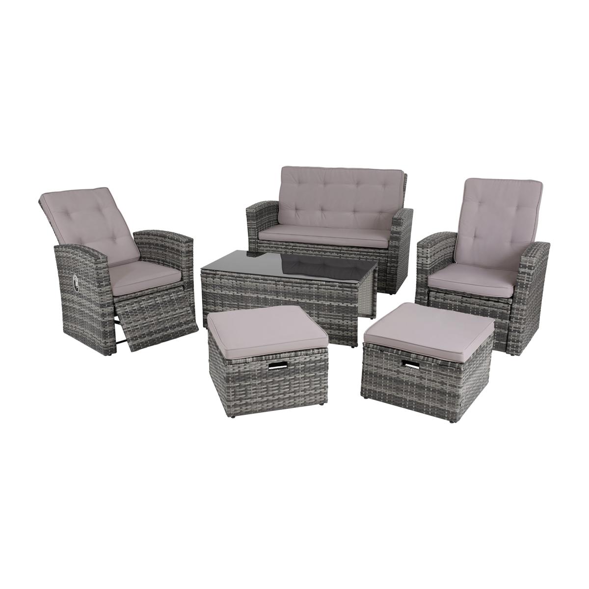 With the cosy garden rattan furniture set Bari from tectake you can relax and enjoy the summer from the comfort of your home garden. The inviting patio ensemble offers six comfortable seats which can be individually grouped around the elegant outdoor coffee table with its large pane of tinted safety glass. The sets two armchairs with their high and infinitely adjustable backrests ensure optimal comfort whilst the 2 seater sofa offers space to lounge and relax. With the chairs, sofa and stools, you can group the set as desired to fit any corner so you're ready to enjoy a relaxed outdoor dining experience. When it comes to stability, resilience and strength, the easy-care set scores with its rust-free aluminium frame and hard-wearing polyrattan mesh. The right choice for every outdoor space the versatile garden rattan furniture set Bari from tectake.