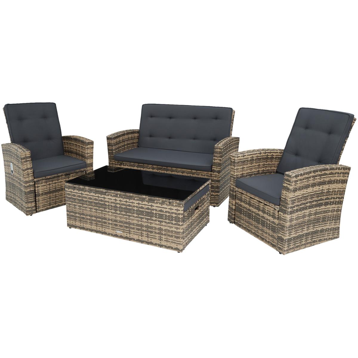 With the cosy garden rattan furniture set Bari from tectake you can relax and enjoy the summer from the comfort of your home garden. The inviting patio ensemble offers six comfortable seats which can be individually grouped around the elegant outdoor coffee table with its large pane of tinted safety glass. The sets two armchairs with their high and infinitely adjustable backrests ensure optimal comfort whilst the 2 seater sofa offers space to lounge and relax. With the chairs, sofa and stools, you can group the set as desired to fit any corner so you're ready to enjoy a relaxed outdoor dining experience. When it comes to stability, resilience and strength, the easy-care set scores with its rust-free aluminium frame and hard-wearing polyrattan mesh. The right choice for every outdoor space the versatile garden rattan furniture set Bari from tectake.