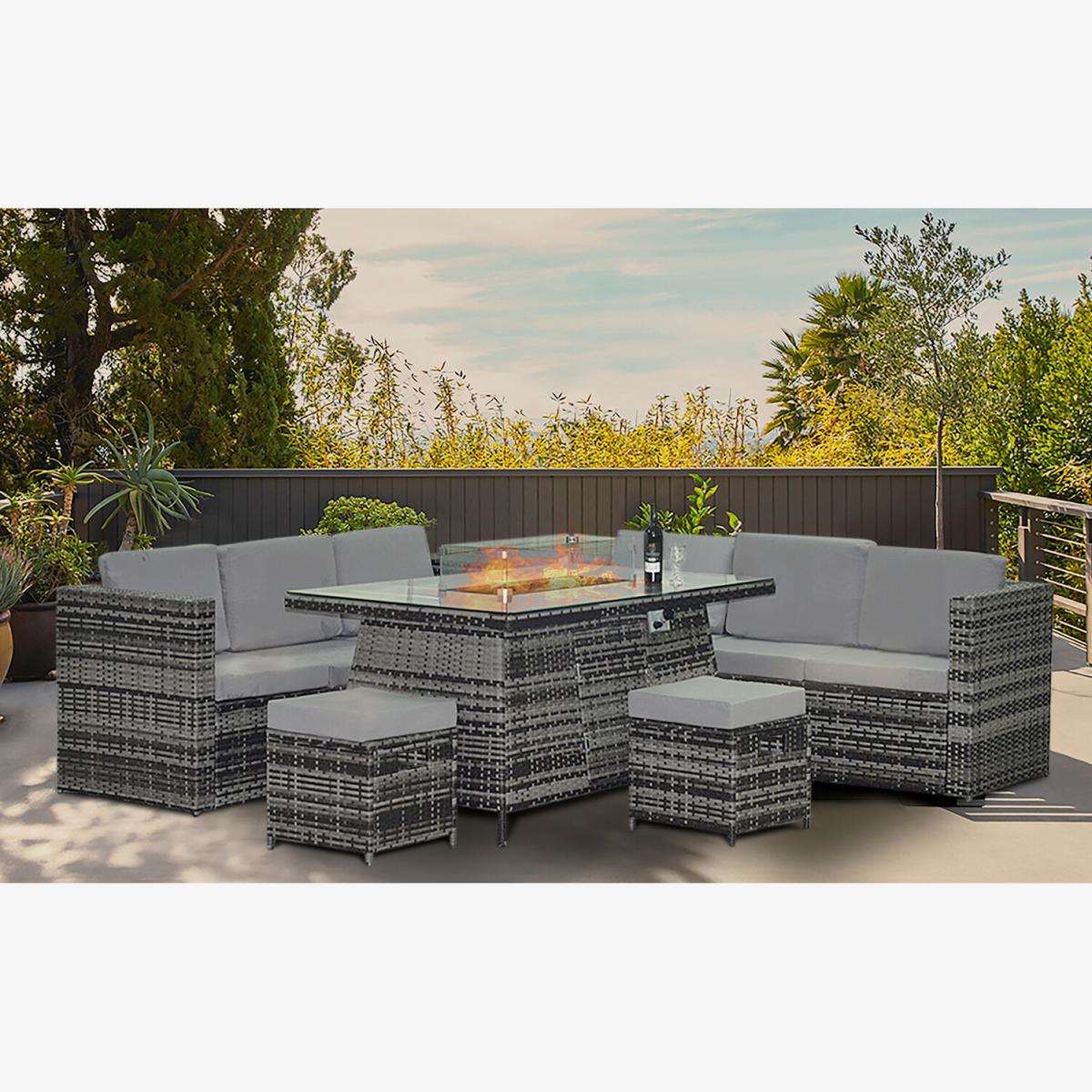 Is your outdoor seating area in need of an upgrade? Then look no further than our super stylish Rattan furniture set, designed to look fabulous and feel even better! Perfect for your patio, garden, or courtyard. Make the most of your outdoor space and create a compact, comfy area to sit back and relax as you entertain your family & friends. Seat up to 8 people - this set includes 2x three-seater sofa, 2x square stools, 1x centre table complete with a fire pit, 1x corner table. The centre table features built-in controls and space for a gas canister. The 10cm padded cushions make for a comfortable seat and are covered with high-quality polyester fabric. This rattan set is made from high-quality, hand-woven, recyclable PE wicker rattan. It is UV resistant as well as very easy to maintain. The fire pit is sleek, stylish and constructed with tempered, scratch-proof safety glass - perfect for all outdoor spaces. Please use a damp cloth or antibacterial wipes to spruce up your rattan set and keep it looking as good as new. The cushion covers are dirt & rain-shower resistant - they can also be removed and gently hand washed. Our rattan sets are constructed with powder-coated, high-grade metal frames that are both rust and corrosion-proof. It's super easy to maintain giving you an outdoor set that looks consistently great throughout all the seasons.