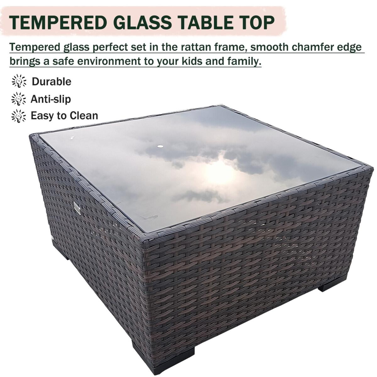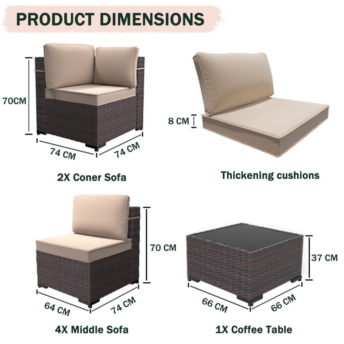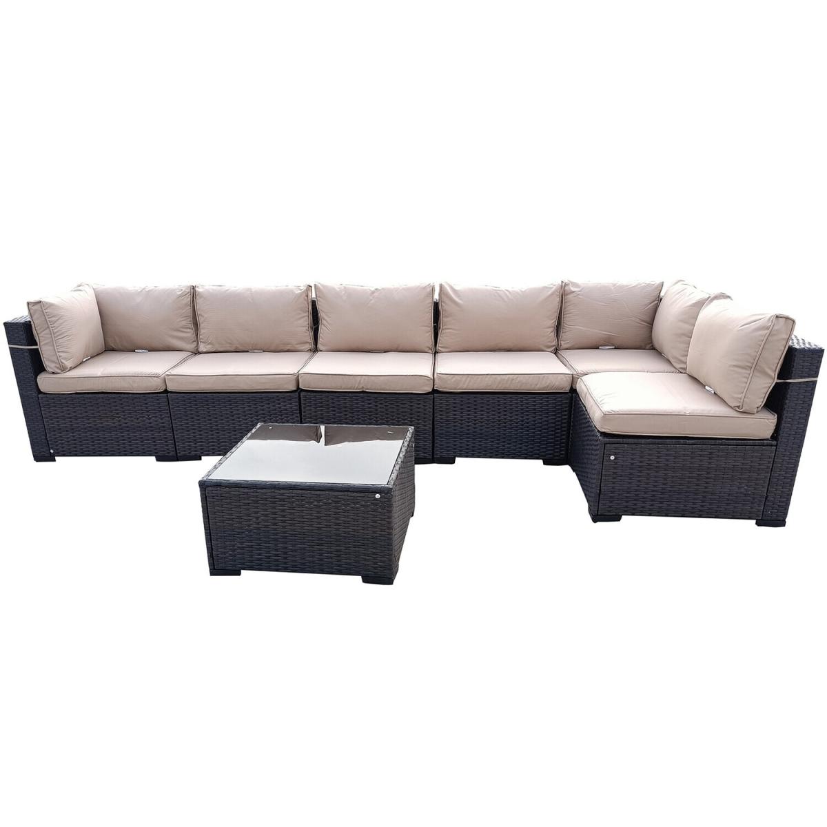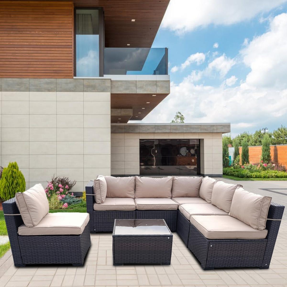 Sturdy and Durable: This outdoor sectional sofa set is made of a solid powder coated cross structure steel frame, rustproof and sturdy & hand-woven PE wicker offers high tensile strength, and water resistance, which is strong enough to withstand all-weather variations for long service life. Modern and Comfortable: This modern outdoor patio sofa set comes with wide and deep seats and 8cm thick lofty sponge padded cushions, providing with extraordinary comfort while you enjoy a coffee in the morning sun, tea after lunch, and a beer at a party. Easy to Clean and Maintain: the waterproof wicker and removable tempered glass top for the coffee table, our wicker patio conversation set is easy to wipe cleaning and maintain & zippered cushion covers are made of superior fabric, which is fade resistant, spill repellent, and washable. Free Combination: Each part of this 7-piece patio furniture can be used separately, and easily changed to different shapes for seating or lying. Ideal for an outdoor patio, porch, backyard, and balcony.
