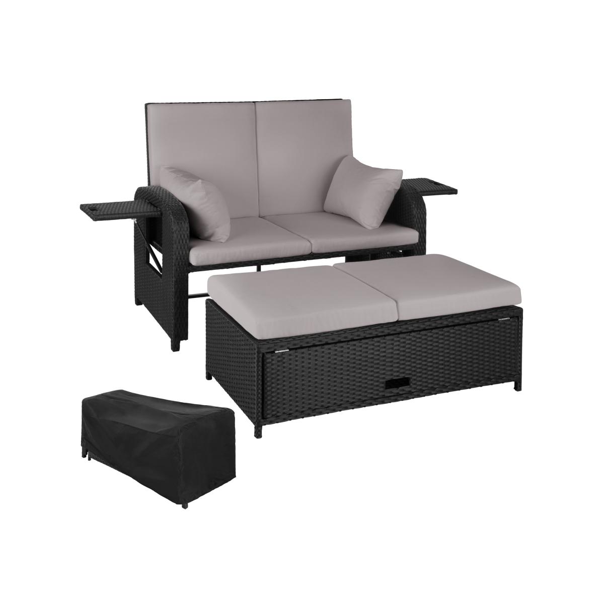 This multifunctional rattan sofa from tectake features extra-soft cushions and an adjustable backrest for optimal comfort. In just a few movements, you can convert this elegant 2 seater into an inviting double lounger. The garden furniture set even features fold-out side tables, perfect for holding drinks and snacks. The compact sofa along with the practical stool with storage space are delivered already assembled, so they can be put to use on your patio straight away. The sets stool can be used to store the waterproof cushions. The high-quality, durable polyrattan weave and the stable aluminium base make this completely rust-free rattan sofa from tectake the perfect piece of outdoor furniture for your home.
