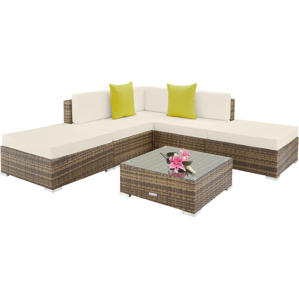 Whether in the garden or indoors, the tectake polyrattan garden furniture sofa set can be used in versatile ways and formats and will visually enhances your garden, patio, conservatory or living room. The elegant table is the perfect place to hold drinks and snacks so you can enjoy a relaxed outdoor dining experience. The comfortable chairs feature thick cushions which are sure to provide relaxing hours, catching up with friends and family. The garden furniture seater set not only impresses with its elegant appearance but also through its long life span thanks to the polyrattan weave. Due to the low weight, the furniture can be easily transported and repositioned to your desired format. The tables top is made of glass, which gives it an elegant look and makes it easy to clean. The comfortable, polyester seat cushions are perfectly colour coordinated with the rattan set and feature a zipper on the back, allowing for easy cleaning. To protect the padding from water, the surface is impregnated, meaning drops of dirt and water simply roll off. Through the various single elements, the garden furniture set can be arranged according to your wishes and needs. The outdoor furniture sets accessories even include two additional cushions, which further enhance its appearance. Order this great rattan garden furniture set from tectake for your home and turn your patio or garden into an open air living room.