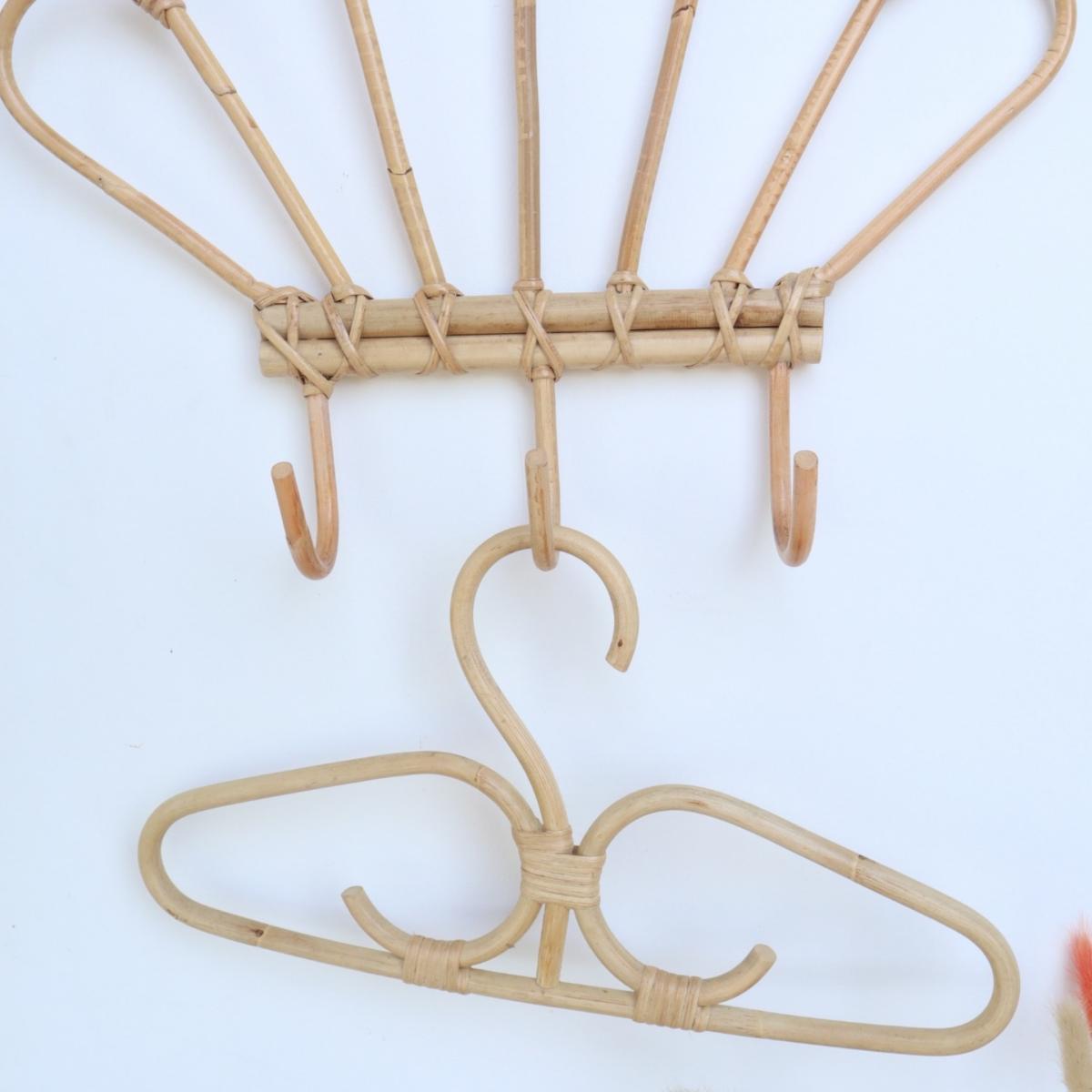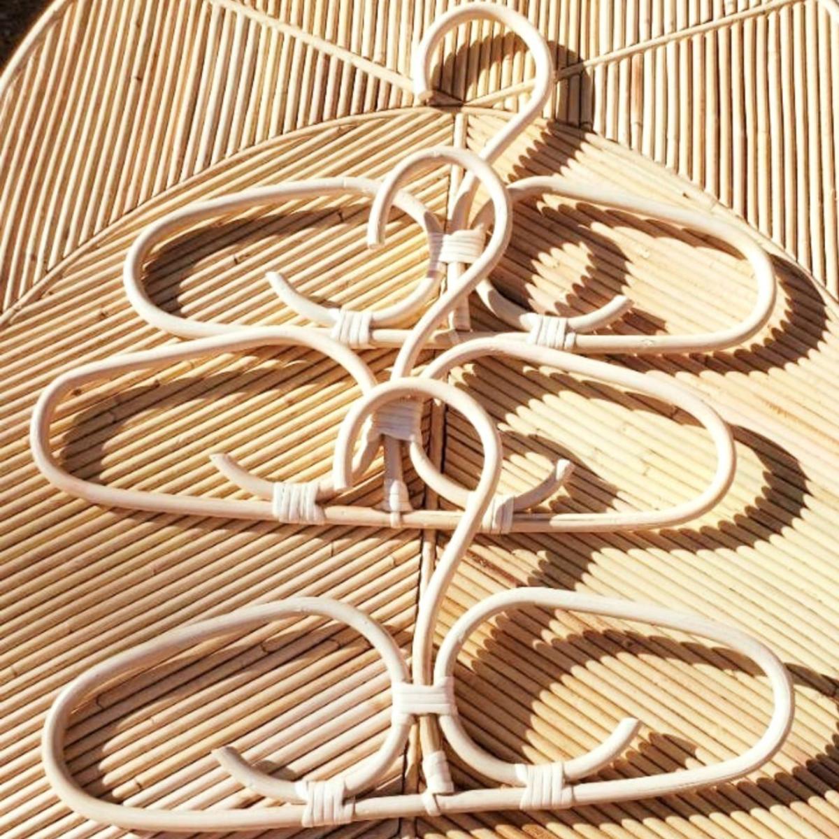Sturdy and built to last, these all-purpose handcrafted adult rattan hangers feature broad shoulders, rounded edges and a gentle slope to help maintain the shape of your clothes in place. Set come in 3 pcs hangers. Material: Rattan. Handcrafted with love by our local artisans in Bali.