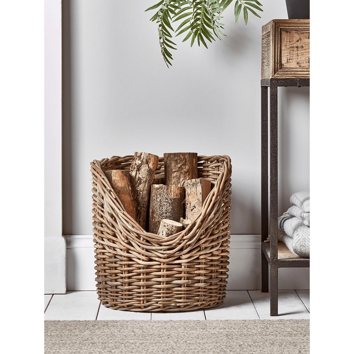 Crafted from chunky round rattan for a rustic finish, our simple asymmetric log holder is the perfect fireside storage solution. Each features a generous capacity for storing logs without compromising on space or style in your living space.