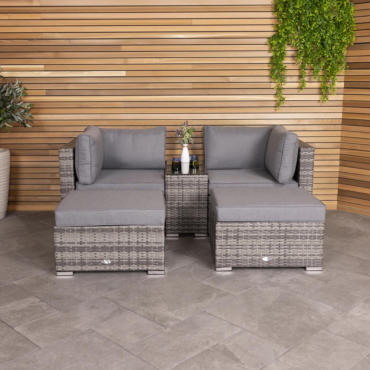 Relax outdoors in luxurious comfort with our contemporary rattan lounge set, perfect for adding a stylish touch to any garden or patio. A perfect set for two to four people, this set comprises of a companion seat, 2 footstools, a coffee table and cushions, for added support. Highly versatile, this impressive lounge set can be used as a day bed, sofa, L-shaped sofa or a 4 seater lounge set. The coffee table is finished with tempered glass, for added durability. Made from a flat weave variegated rattan which is weatherproof, this durable lounge set can withstand harsh elements. Available in a choice of either grey or natural, this fashionable set can be teamed perfectly with other products among our rattan collection.