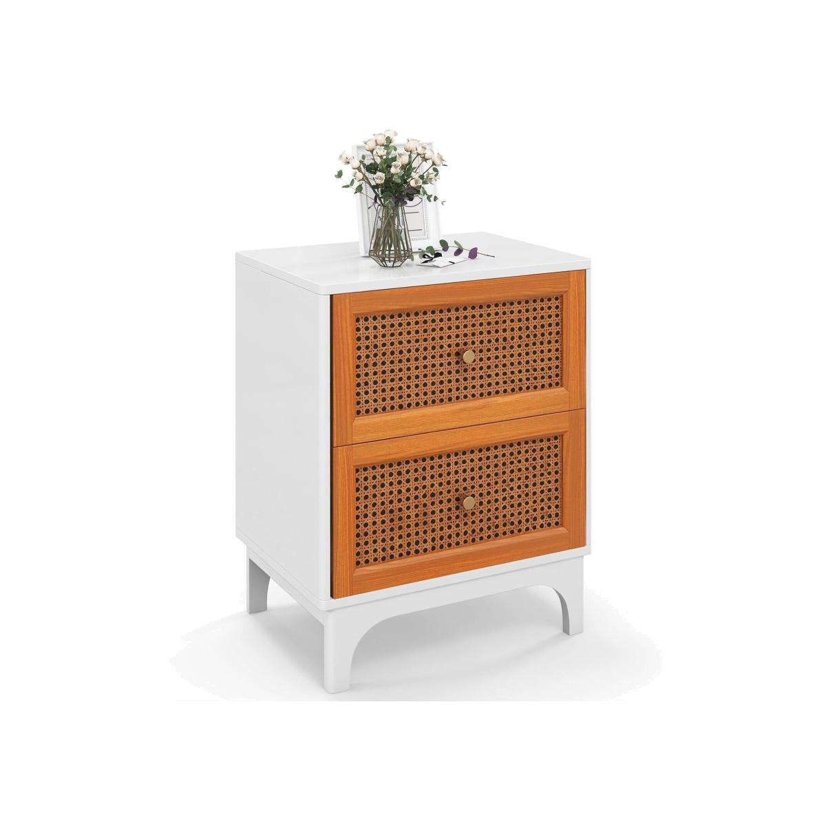 Transform your bedroom into a Boho paradise with this stylish nightstand! Immerse yourself in the charm of handwoven natural rattan on the drawer fronts, complete with striking golden knobs that add an elegant touch. With 2 generously-sized drawers, say goodbye to clutter! Store your beloved books, electronics, and more with ease. Crafted from a durable combination of MDF and pine wood, this bedside table is built to endure, ensuring long-lasting durability. But wait, there's more!