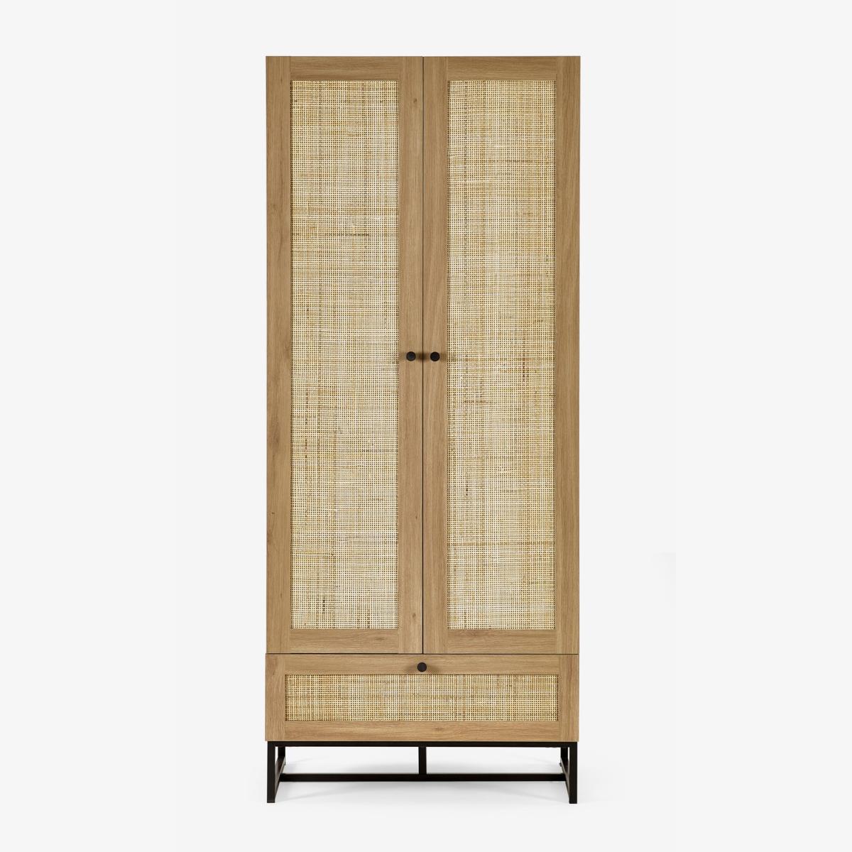 Features we love 2-door wardrobe with drawer and natural rattan fronts Perfect for any bedroom with oak effect and wicker Double wardrobe has plenty of storage space Industrial style black legs and handles add contrast Part of the Julian Bowen Padstow bedroom collection All about me This Padstow rattan 2 door wardrobe is a perfect mix of modern and retro design that complements any bedroom decor. Check out the rest of the range which features a bedside table, 3-drawer chest, and 6-drawer chest. It's also available in black. Need to know Dimensions: W80 x D56 x H190 cm Internal dimensions: W75 x D56 x H145 cm Drawer dimensions:W70 x D36 x H22 cm Number of drawers: 1 Weight: 67kg Colour: Brown and black Material: Melamine, rattan front and metal base Assembly required: Yes Guarantee: 12 months