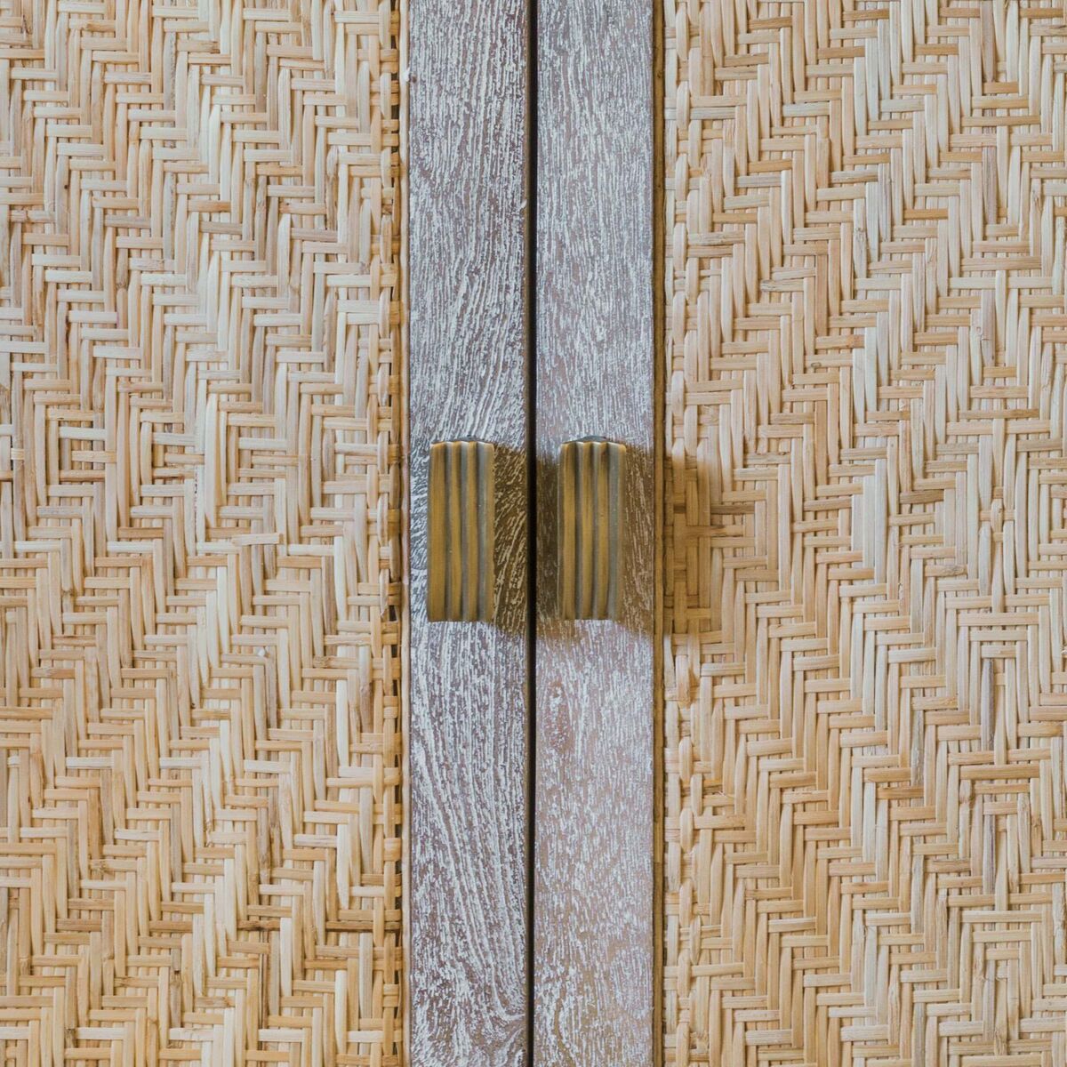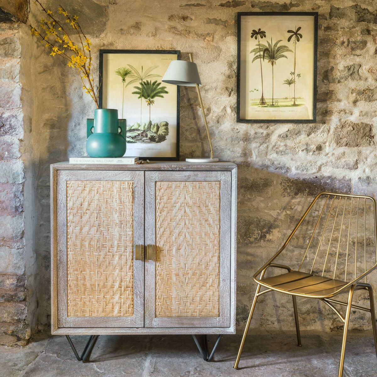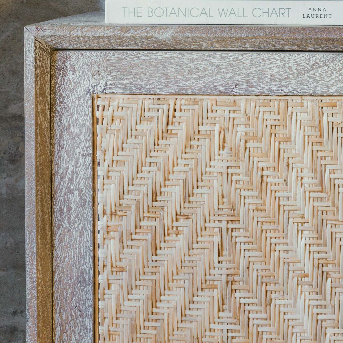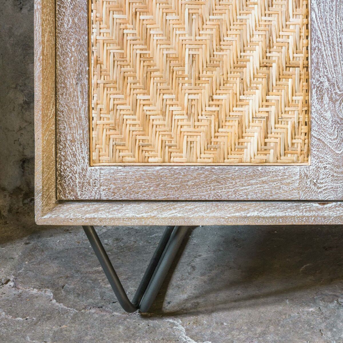 A modern take on a 70s classic, this sideboard features metal hairpin legs and an intricately handwoven rattan detailing that adds to its character. All in a hand rubbed finish making each piece completely unique. H89 x W81 x D40. 5cm. Made of mango wood. Whitewashed finish. Handwoven rattan front. Brass finished handles. Features two doors and two shelves. Due to the handmade nature of this product, size, colour and pattern may vary. To avoid watermarks and heat damage, do not place items such as ceramics, tableware or glassware directly onto the surface of any of our furniture without the protection of a heat resistant mat, coaster and/or trivet as this could mark the surface.