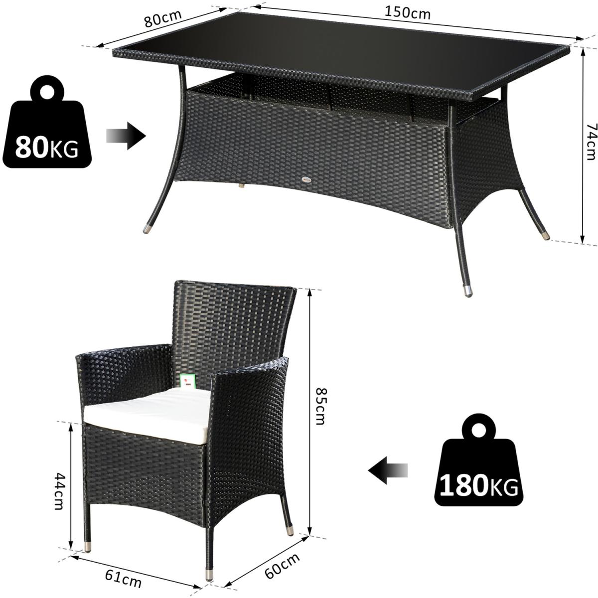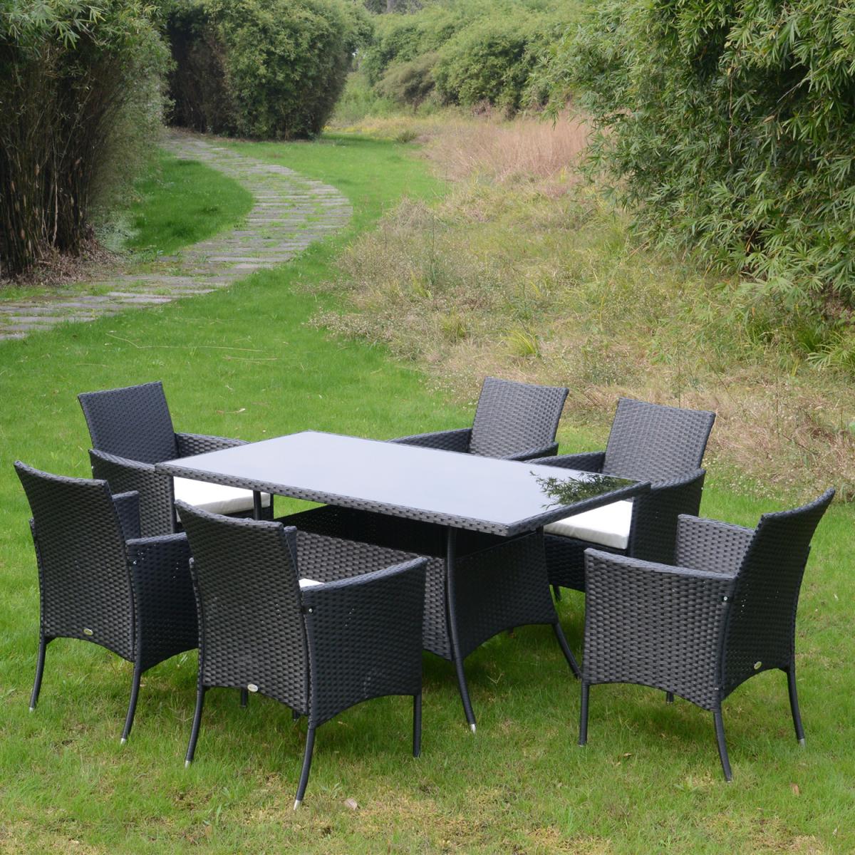 This deluxe 7piece rattan dining set is a great addition to the patio or garden, made with high-quality PE rattan and durable steel construction for sturdiness and long-lasting. It also comes complete with a 5mm thick tempered glass for the tabletop, so you can use it on a daily basis. It's easy to maintain and keep clean using a damp cloth.