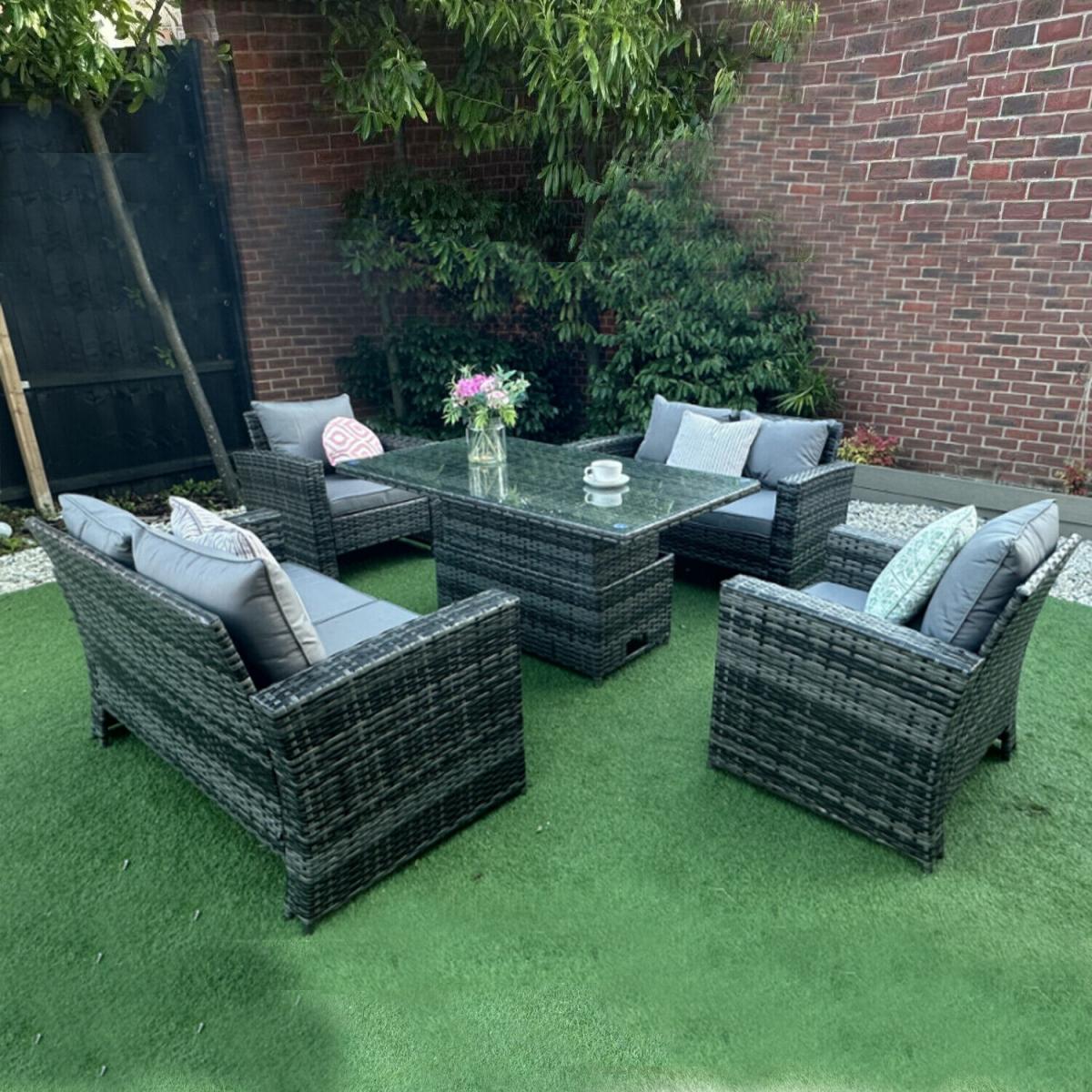 Relaxing evening times need never be cold again - do it in one with this Furniture One Designs rattan set, with rising table. Steel frame for a supportive core, with plastic wicker for style and extra durability.- Padded cushions for you to relax. Rattan Wicker Garden Lounge Set with Cushions - Grey / 2*2 seater sofa2*arm chair1*Rising Table